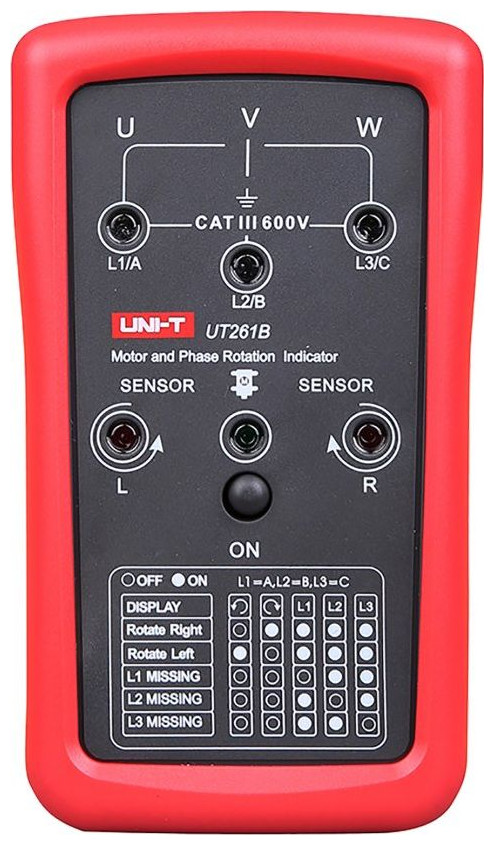 PARAMETRY PRACY: Napięcie prądu AC: 90~600 V Częstotliwość: 15~400Hz Natężenie prądu pracy: < 3 mA FUNKCJE: Wykrywanie kolejności faz: Powiadomienie LED Wykrywanie brakującej fazy: Powiadomienie LED Wskazanie obrotów silnika: Powiadomienie LED CECHY OGÓLNE: Zasilanie: Bateria 9 V (6F22) Wymiary: 123 x 71 x 29 mm Waga: 180 g Akcesoria: Bateria, przewody pomiarowe