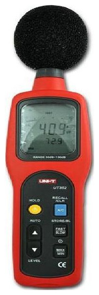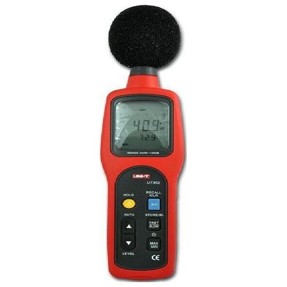 MIE0129 Mier.poziomu głośności UT352 Zakres: 30 - 130 dB Dokładność: +/-1.5dB Zakresy: 30 - 80 dB, 50 - 100 dB, 60 - 110 dB, 80 - 130 dB Zakres częstotliwości: 31.5 - 8000 Hz Wybór współczynnika częstotliwości: A/C Wybór czasu: - FAST (szybki): co 125ms - SLOW (wolny): co 1s Bargraf: 30 - 130 dB Wyjścia: - AC: 0.707 V RMS (cała skala), impedancja wyjścia: ok.600 Ohm - DC: 2 V RMS (cała skala), 10mV/dB, impedancja wyjścia: ok.100 Ohm Funkcje specjalne: - Ostrzeżenia: powyżej"OVER"/poniżej"UNDER" zakresu - wartość minimalna/maksymalna - zatrzymanie ostatniego wskazania - podświetlenie wyświetlacza - praca w uśpieniu - wskaźnik wyczerpanej baterii (4.8V) - pamięć 63 odczytów Zasilanie: 4x bateria 1.5V (AA) Wymiar LCD: 53 x 41 mm Wymiary gabarytowe: 273 x 70 x 39 mm Waga: 390g