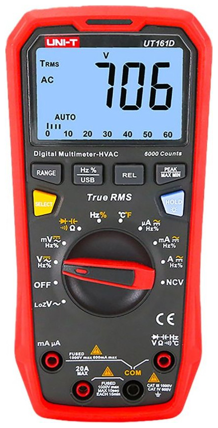 ZAKRESY POMIAROWE Napięcie stałe DC: 1000 V ?(0,5%+3) Napięcie zmienne AC: 1000 V ?(1%+3) Natężenie prądu stałego DC: 20 A ?(1%+2) Natężenie prądu zmiennego AC: 20 A ?(1,2%+5) Rezystancja: 60 MOhm ?(1%+2) Pojemność: 60 mF ?(3%+5) Częstotliwość: 10 MHz ?(0,1%+4) Temperatura: -40°C ~ 1000°C ?(1%+3), -40°F ~ 1832°F ?(1%+6) Współczynnik wypełnienia: 0,1% ~ 99,9% ?(2%+5) Test diod Sprawdzanie ciągłości obwodu DODATKOWE FUNKCJE Automatyczna zmiana zakresów pomiarowych Pomiar True RMS Pomiar natężenia pola elektomagnetycznego Filtr dolnoprzepustowy Zamrożenie ostatniego wskazania Zapis wartości peak Tryb pomiaru względnego Zapis wartości MAX/MIN/peak Analogowy bargraf: 31 segmentów Automatyczne wyłączanie Maksymalny odczyt: 6000 CECHY OGÓLNE Zasilanie: 4x bateria 1,5 V (R03) Wymiary: 190 x 90 x 50 mm Waga produktu: 350 g Akcesoria: baterie, przewody pomiarowe, przewód USB, sonda pomiaru temperatury, przystawka