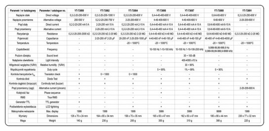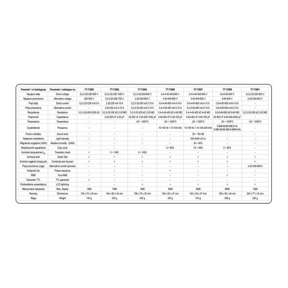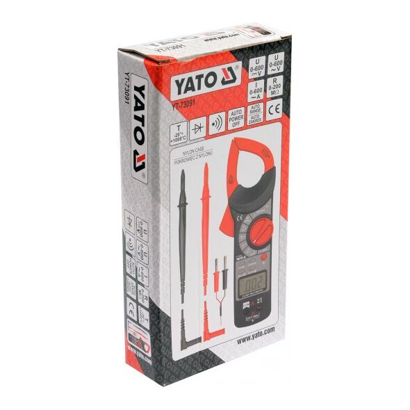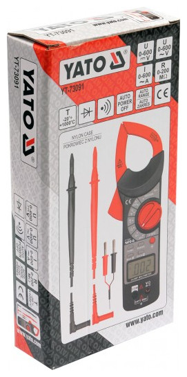 Αριθμός αντικειμένου YT-73091EAN 5906083730917Υλικό περίβλημα - Πλαστικό Μεικτό βάρος (g) Μέτρηση τάσης 575 AC 0-600V ±1,2% μέτρηση τάσης συνεχούς ρεύματος 0-600V ±1,0% AC ρεύμα 0-600A κατώτερης έντασης 0-600Α ± 3%Μέτρηση συχνότητας -Δοκιμή διόδου 1mA, μέτρηση hFe τρανζίστορ 1,48V -Μέτρηση θερμοκρασίας -20 έως 1000°C Μέτρηση θορύβου -Μέτρηση φωτισμού -Μέτρηση χωρητικότητας -Συχνότητα δειγματοληψίας 3x/s Μέτρηση συντελεστή πλήρωσης -Δυνατότητα σύνδεσης με ηλεκτρονικό υπολογιστή -Αυτό