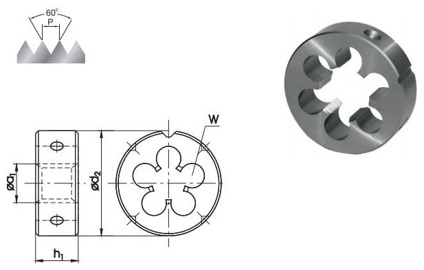 Die M8x1 HSS 1.75P 6g - N1-121001-0083 Τύπος υλικού: HSS Λοξοτομή: 1,75P Ανοχή: 6g Διάμετρος d1: M8x1 Διάσταση P: 1mm Διάμετρος d2x1: 25x9mm Διάσταση W: 4mm{Συσκευασία} Τέχνη . {Μέγεθος}M8x1