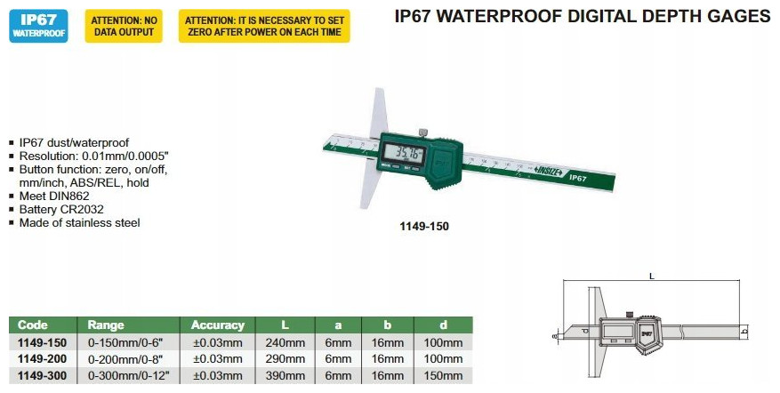 Insize głębokościomierz elektroniczny IP67 wodoodporny -klasa wodoodporności IP67 -odczyt0,01mm -zerowanie w dowolnym miejscu pomiar w mm i calach -wyprodukowany zgodnie z DIN862 -zasilanie bateria CR2032 -wyprodukowane ze stali nierdzewnej -kod producenta 1149-150 W ofercie znajdziesz m.in.: > Narzędzia skrawające - noże tokarskie, płytki frezarskie i tokarskie, głowice frezarskie, gwintowniki, narzynki, frezy, wiertła, rozwiertaki, nawiertaki, pogłębiacze, itd, > Osprzęt maszynowy - uchwyty tokarskie i wiertarskie, imadła, oprawki do toczenia i frezowania, tulejki zaciskowe itd. > Narzędzia pomiarowe - kątowniki ,poziomnice, suwmiarki, mikrometry, szczelinomierze, sprawdziany do gwintów i otworów itd. > Materiały ścierne - tarcze do cięcia i szlifowania, tarcze ceramiczne, arkusze, krążki, pasy ścierne, ściernice trzpieniowe, itd. > Narzędzia ręczne - klucze, wkrętaki, pilniki ręczne, szczypce, końcówki wkrętakowe, zestawy naprawcze do gwintów itd.