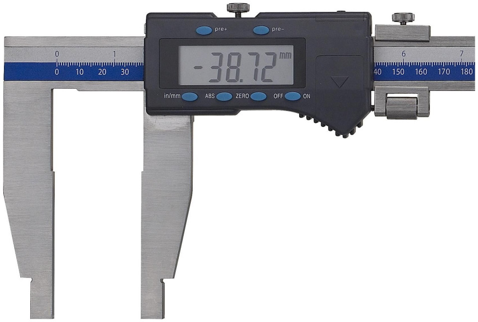Ψηφιακή δαγκάνα. Κατασκευασμένο από ανοξείδωτο χάλυβα. Συνάρτηση μέγιστης/ελάχιστης τιμής Λειτουργία HOLD. Επιλέξτε οθόνη σε mm ή ίντσες. Ρύθμιση της τιμής αναφοράς. Λεπτή βίδα ρύθμισης. DIN 862. Περιλαμβάνεται μπαταρία CR2032.
