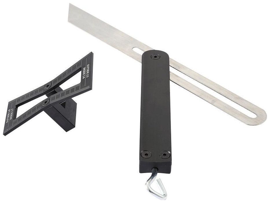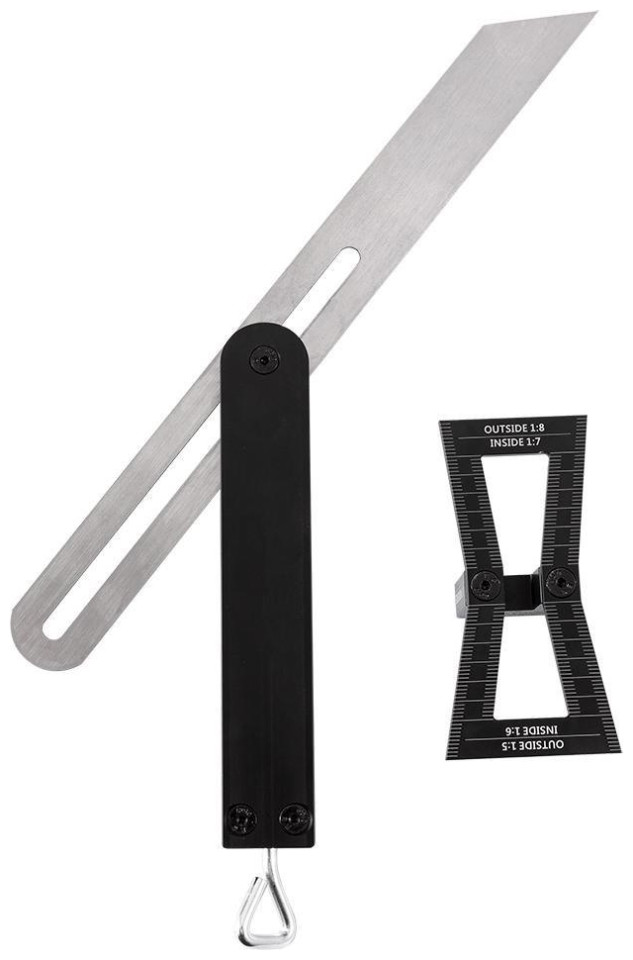 Kątownik regulowany, ostrze ze stali nierdzewnej, uchwyt i jaskółczy ogon z aluminium, blokada stalową nakrętką motylkową umieszczoną w stalowym gwincie, możliwość ustawienia dowolnego kąta, dodatkowo dołączony jaskółczy ogon do kreślenia połączeń drewna, skala: 1:5, 1:6, 1:7, 1:8