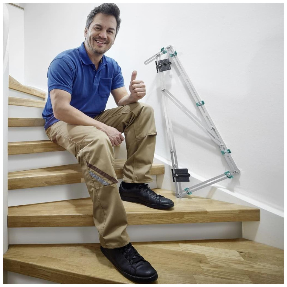 Składana miarka do schodów łączy zalety pająka do schodów ze standardowymi miarkami kątowymi. Wbudowane kliny dystansowe i adaptery do różnych kształtów (np. schodów) uzupełniają zestaw.