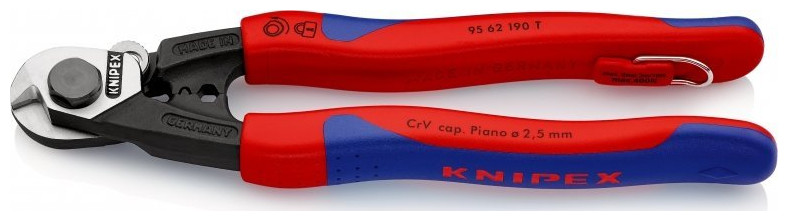 Knipex 95 62 190 T. Τύπος προϊόντος: Χειροκίνητος κόφτης καλωδίων, Χρώμα λαβής: Μπλε, Κόκκινο, Υλικά: Πλαστικό, Ατσάλι. Μήκος προϊόντος: 190 mm, Πλάτος προϊόντος: 65 mm, Βάρος προϊόντος: 345 g