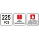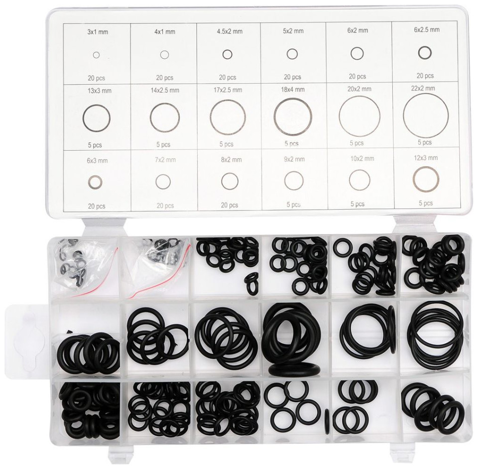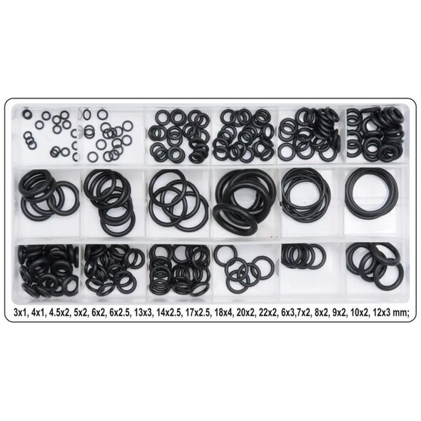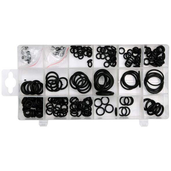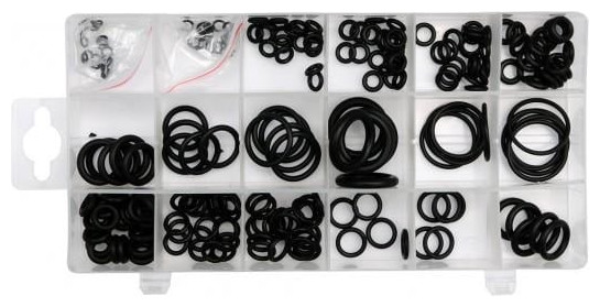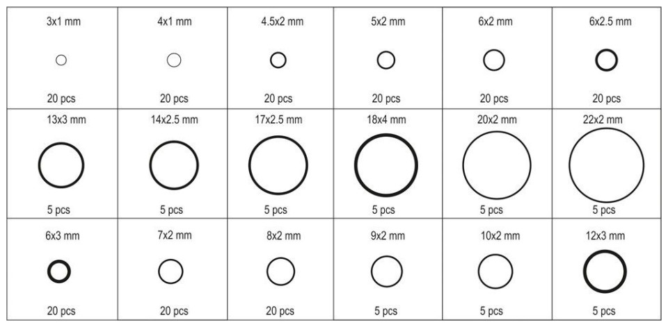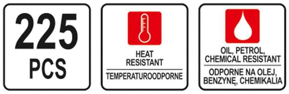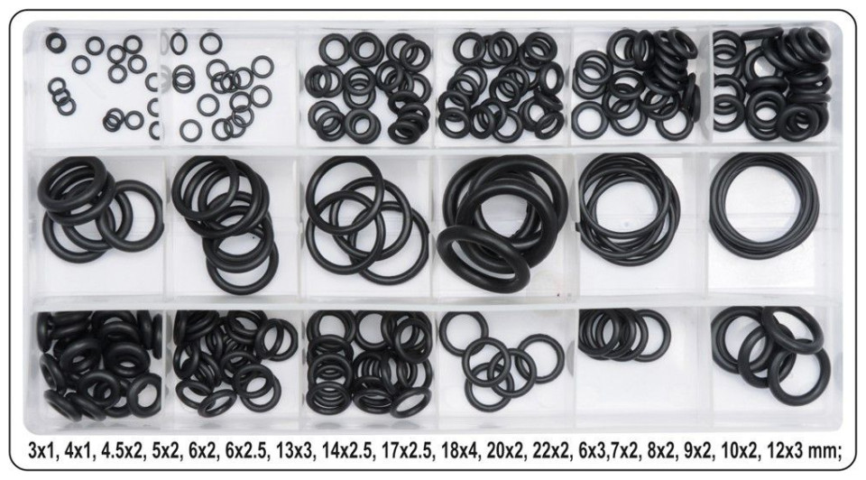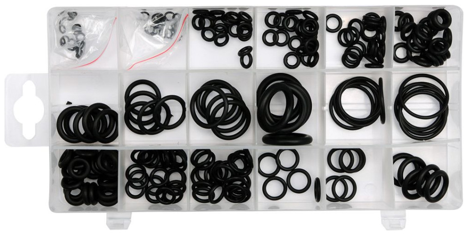 Ένα πρακτικό σετ 225 δακτυλίων από καουτσούκ. Περιέχει ένα μείγμα 18 διαφορετικών μεγεθών. Οι δακτύλιοι Ο είναι κατασκευασμένοι από καουτσούκ ανθεκτικό σε επιθετικούς παράγοντες όπως καύσιμα, λάδια, χημικά και υψηλές θερμοκρασίες. Η πρακτική συσκευασία επιτρέπει την εύκολη πρόσβαση σε ένα βολικό μέγεθος.
