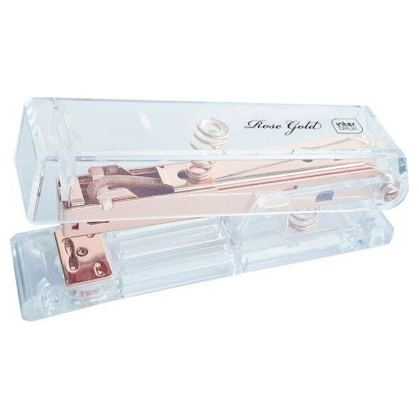 Κομψό και μοντέρνο συρραπτικό από μέταλλο σε ροζ χρυσό σε διάφανο περίβλημα. Ελαφρύ και εύκολο στη χρήση, ιδανικό για σχολείο, γραφείο και σπίτι. Εξοπλισμένο με δύο επιλογές συρραφής. Μέγεθος συνδετήρων: 24/6 ή 26/6. Συρραπώνει έως και 20 φύλλα χαρτιού.
