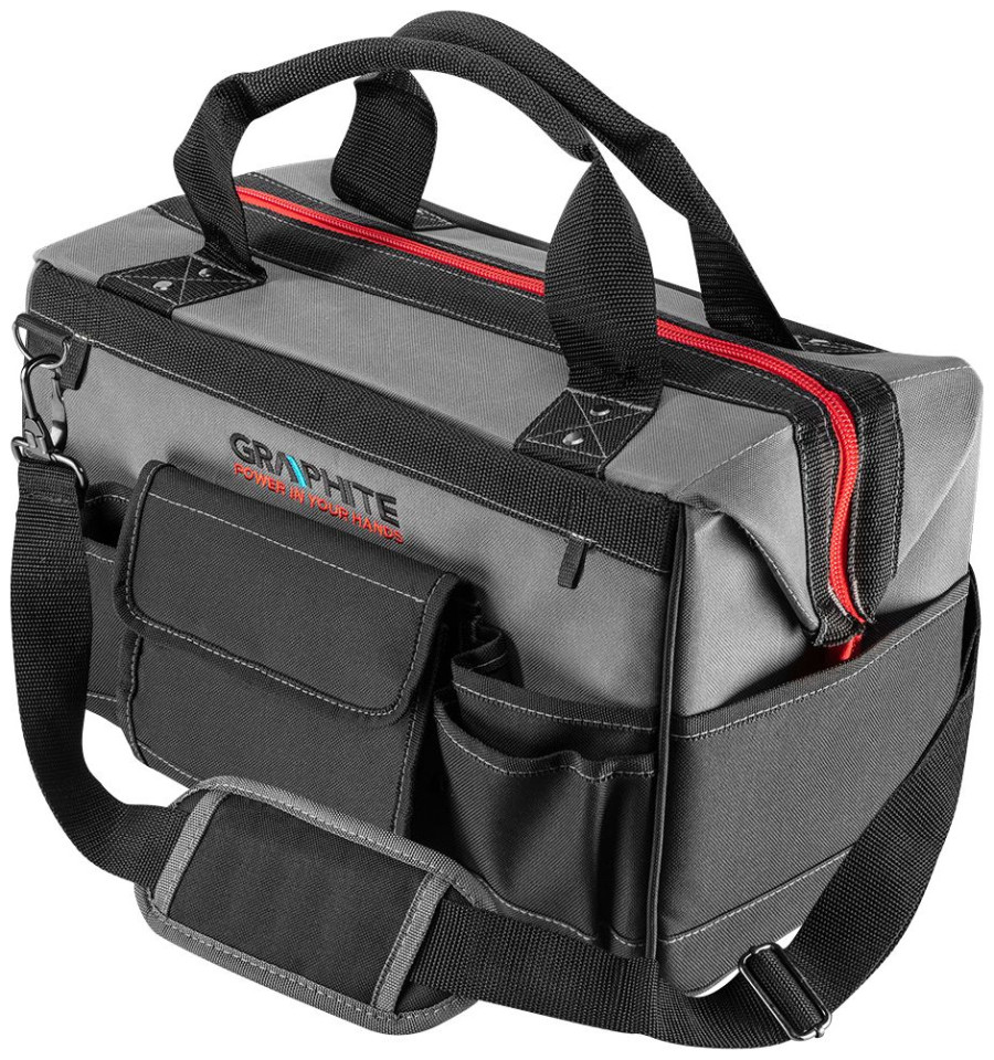 Υλικό: πολυεστέρας{Type} Τσάντα εργαλείων . {Adjust strap size} Ναι. {Υλικό} Ύφασμα. {Βάθος} 21 cm. {Ύψος} 24 cm. {Μοντέλο} 58G092 . {Χρώμα} Μαύρο και γκρι . {Πλάτος} 41 cm