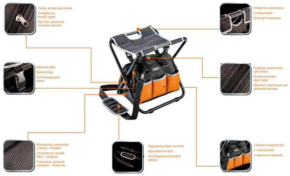 Το σκαμπό με αποσπώμενη τσάντα θα χρησιμοποιηθεί για εργασία στις πιο δύσκολες συνθήκες εργασίας