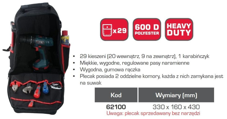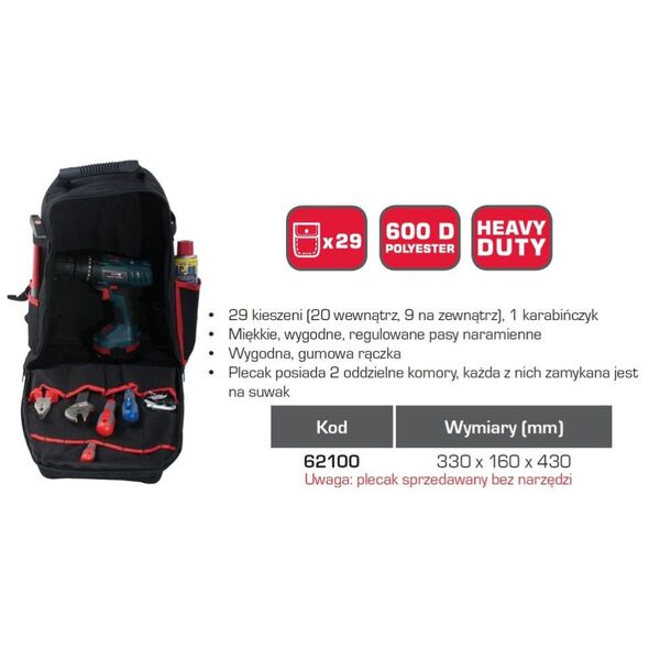Διαστάσεις: 330x160x430 mm{Type} Σακίδιο εργαλείων . {Type} Σακίδιο εργαλείων . {Model} 62100 . {Model} 62100 . {Adjust strap size} Ναι. {Adjust strap size} Ναι. {Υλικό} Ύφασμα. {Υλικό} Ύφασμα. {Ύψος} 33 cm. {Ύψος} 33 cm. {Χρώμα} Μαύρο και κόκκινο. {Χρώμα} Μαύρο και κόκκινο. {Πλάτος} 43 cm. {Πλάτος} 43 cm. {Βάθος} 16 cm . {Βάθος} 16 cm . {Αριθμός τσέπες} 29 . {Αριθμός τσέπες} 29