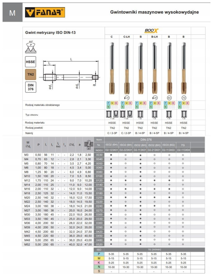 Προϊόν: Περιγραφή: D2-113X01-0300: Tap 800X M30 -6H DIN-376 B HSSE TN Η βρύση 800X είναι μια έκδοση ανάπτυξης της νέας βρύσης που ονομάζεται 800. Η σχεδίασή της έχει τροποποιηθεί σημαντικά, η οποία επεκτείνει την εφαρμογή της χωρίς χάλυβα . Οι καινοτόμες τεχνολογίες παραγωγής που χρησιμοποιούνται εξασφαλίζουν έως και διπλάσια αντοχή και αποτελεσματικότητα επεξεργασίας. Όλα αυτά τα χαρακτηριστικά καθιστούν το 800X tap την καλύτερη επιλογή για μικρές και μεσαίες σειρές παραγωγής, προσφέροντας καλή σχέση ποιότητας/τιμής. Εφαρμογή: για ανθρακούχο χάλυβα για χάλυβα χαμηλής περιεκτικότητας σε κράμα για φερριτικό και μαρτενσιτικό ανοξείδωτο χάλυβα για ωστενιτικό και ωστενιτικό-φερριτικό ανοξείδωτο χάλυβα για χυτοσίδηρο, ελατό χυτοσίδηρο και όλκιμο χυτοσίδηρο για μη σιδηρούχα υλικά Προβλεπόμενη χρήση: σπείρωμα σε μηχανές CNC με σύγχρονο thre λειτουργία και βάσεις με ελάχιστη αξονική αντιστάθμιση - OGSS ή MasterSync πιθανή κλωστή σε συμβατικά μηχανήματα σε υποδοχές OGK σειράς μικρής και μεσαίας παραγωγής Εύρος διαστάσεων: M: M3÷M52 MF: M8x1÷M16x1.5 Διαθέσιμες ποικιλίες: Για διαμπερείς οπές 800X2 B-TN2D 113X01-0300 κρουνός μηχανής υψηλής απόδοσης 800X