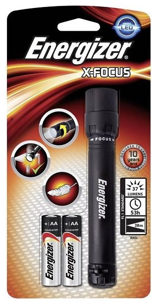 Φακός Energizer X-Focus Led 2AA, 1 LED, ρυθμιζόμενη εστίαση φωτός |{Χρώμα} Μαύρο. {Πηγή φωτός} LED . {Τροφοδοσία} 2 x AA . {Type} Universal . {Εύρος [m]} 38 . {Φωτεινή ροή [lm]} 37