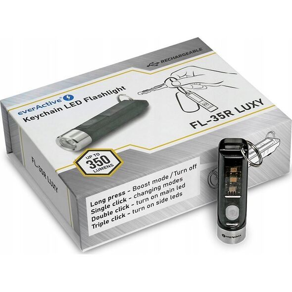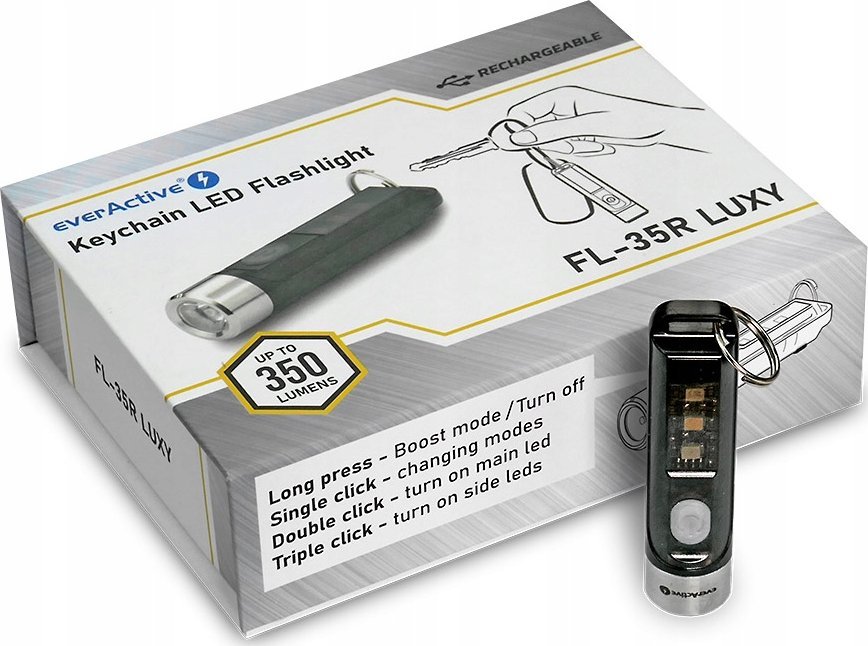 FL-35R to latarka w formie breloka, o potężnym strumieniu świetlnym spod brandu everActive. Maksymalna siła światła na poziomie 350 lumenów zapewnia doskonałe oświetlenie najbliższego otoczenia nawet w całkowitej ciemności. Niekwestionowanymi atutami naszych latarek są m.in. - wysoka jakość wykonania, uniwersalność oraz wykorzystywanie najnowocześniejszych rozwiązań dostępnych na rynku.Wejdź na wyższy poziom z everActive! Latarka everActive FL-35R jest wyjątkowo wygodna w użyciu - poręczna, wykonana z trwałego tworzywa sztucznego charakteryzującego się podwyższoną wytrzymałością. Nasza latarka została wyposażona w nowoczesne diody LED w aż trzech kolorach! Dzięki wysokiej klasy podzespołom latarka wydaje się kompletna, sprawdzi się zarówno podczas nocnego spaceru, jak i backpakingowego wyjazdu. Obudowa urządzenia została wykonana z wyjątkowo wytrzymałego tworzywa sztucznego, stopień ochrony IPX4. Urządzenie jest zasilane akumulatorem litowo-polimerowym o pojemności 300mAh! Akumulator nie jest wymienny, jego ładowanie odbywa się przy użyciu portu USB-C zintegrowanego w latarce, czas ładowania to około 1h. W skład zestawu wchodzą: latarka oraz kabel USB-C do ładowania. Całość estetycznie zapakowana w eleganckie pudełko prezentowe, idealne na upominek dla bliskiej osoby.Uniwersalność w każdym calu Ze względu na bardzo małe rozmiary latarka FL-35R bez większych problemów zmieści się w nawet najmniejszej kieszonce! Mocne diody LED gwarantują bezpieczne poruszanie się po zmroku, latarka idealnie sprawdzi się w całkowitej ciemności. Dopracowane detale Cechami charakterystycznymi FL-35R jest dbałość o detale, wysokiej klasy podzespoły pozwolą przez długie lata cieszyć się latarką. Urządzenie zostało wyposażone w diodę sygnalizującą poziom naładowania akumulatora - gdy latarka będzie wymagała doładowania, dioda zacznie migać na czerwono. Stworzona, by zaskakiwać Mogłoby się wydawać, że przy tak małych gabarytach latarka nie zachwyci, a ilość wygenerowanego światła będzie raczej niewielka... Nic bardziej mylnego! ten mały, niepozorny brelok potrafi zaskoczyć nawet największych sceptyków! Strumień świetlny na maksymalnym poziomie 350 lumenów utrze nosa nie jednej latarce o zdecydowanie większych gabarytach. Nie wierzysz? Sprawdź!Małe urządzenie, wiele możliwości Ilość trybów pracy, które oferuję latarka, wynosi aż 9! Mnogość możliwych zastosowań urządzenia jest więc bardzo szeroka. W trosce o bezpieczeństwo użytkowników nasza latarka została wyposażona w unikatową funkcję trybu policyjnego. Czujesz się zagrożony? Uruchom latarkę i odstrasz potencjalnych napastników! Przypominamy, że ww. tryb nie jest przeznaczony do zabawy, i należy używać go z rozwagą! Podkręć obroty Potrzebujesz więcej światła? Przytrzymaj włącznik - latarka uruchomi tryb boost generujący mocny strumień świetlny (350lm), ilość wygenerowanego światła zagwarantuje bezpieczne podróżowanie po zmroku.