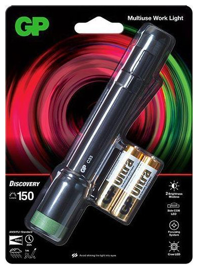 Τεχνικά δεδομένα: Συμμόρφωση με το πρότυπο ANSI FL1: Φωτεινή ροή: 150 lumens Εύρος δέσμης: 100 μέτρα Χρόνος λειτουργίας: 20 ώρες Αντοχή σε πτώση: 1 μέτρο Αδιάβροχη κατηγορία: IPX4 Τύπος δέσμης: ρυθμιζόμενη (ευρεία / εστιασμένη) Δίοδος LED: Cree Διαστάσεις: fi26 x 163 mm Βάρος (με μπαταρίες): 128 g (περίπου) Φακός GP Discovery C33 με πρόσθετο πλευρικό φως Φωτεινός φακός πολλαπλών εργασιών ιδανικός για σπίτι, εργαστήριο, κάμπινγκ ή κατά τη διάρκεια βλάβης στο δρόμο. Εξοπλισμένο με μπροστινό LED 150 lumen και πλαϊνό φως COB 180 lumen. Εμβέλεια δέσμης 100 μέτρα, χρόνος λειτουργίας 20 ώρες. Ενεργοποιήστε και απενεργοποιήστε και αλλάξτε εύκολα τις λειτουργίες φωτεινότητας για μπροστινά και πλαϊνά φώτα με ένα κουμπί. Ρυθμιζόμενο πλάτος δοκού. Βολικό στη χρήση χάρη στο μαγνητικό εξάρτημα και το κλιπ τσέπης. Αδιάβροχο IPX4 Αυτός ο φωτεινός, πολυλειτουργικός φακός έχει σχεδιαστεί για να διευκολύνει πολλές εργασίες και δραστηριότητες σε εξωτερικούς χώρους. Εξοπλισμένο με μπροστινό LED 150 lumen και πλαϊνό φως COB 180 lumen. Εμβέλεια δέσμης 100 μέτρα, χρόνος λειτουργίας 20 ώρες. Ενεργοποιήστε και απενεργοποιήστε και αλλάξτε εύκολα τις λειτουργίες φωτεινότητας για μπροστινά και πλαϊνά φώτα με ένα κουμπί. Το πλαϊνό φως COB παράγει μια ισχυρή λευκή δέσμη και η ρυθμιζόμενη γωνία μπροστινής δέσμης σάς επιτρέπει να φωτίζετε μια μεγάλη περιοχή κοντά ή να εστιάσετε το φως σε ένα μακρινό αντικείμενο. Χάρη στην αντοχή του στο νερό IPX4, είναι ανθεκτικό σε δύσκολες καιρικές συνθήκες και μπορείτε να βασιστείτε σε αυτό ακόμη και σε έντονη ομίχλη ή βροχή. Η μαγνητική τοποθέτηση και το βολικό κλιπ διευκολύνουν τη χρήση του φακού στο σπίτι, στο γκαράζ, στο εργαστήριο και στο δρόμο. Ο φακός είναι επίσης ιδανικός για υπαίθριες δραστηριότητες, όπως νυχτερινές πεζοπορίες, όπου είναι απαραίτητη μια συμπαγής πηγή φωτός: φακός x 1 x 2 αλκαλικές μπαταρίες AA**Εικόνες για λόγους απεικόνισης.{Πηγή φωτός} LED . {Τροφοδοσία} 2 x AA . {Type} Universal