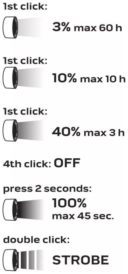 5 λειτουργίες φωτισμού: 100%, 40%, 10%, 3%, στροβοσκοπικό