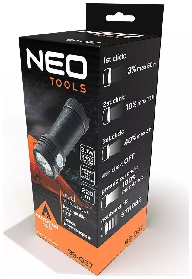 Ο επαναφορτιζόμενος φακός είναι εξοπλισμένος με OSRAM P9 LED ισχύος 30W (3300 lumens). Έχει μέγιστο χρόνο φωτισμού 60 ώρες και μέγιστο εύρος φωτισμού 220 m Ο φακός τροφοδοτείται από μπαταρία Li-Ion 3,7 V χωρητικότητας 4000 mAh που περιλαμβάνεται στο σετ. Ο φακός έχει 5 λειτουργίες φωτισμού: 100%, 40%, 10%, 3%, στροβοσκοπικό. Το IPX4 παρέχει προστασία από πιτσίλισμα νερού από οποιαδήποτε κατεύθυνση.