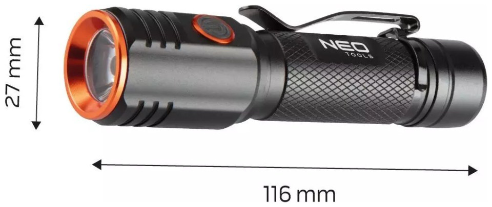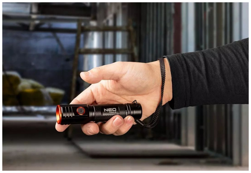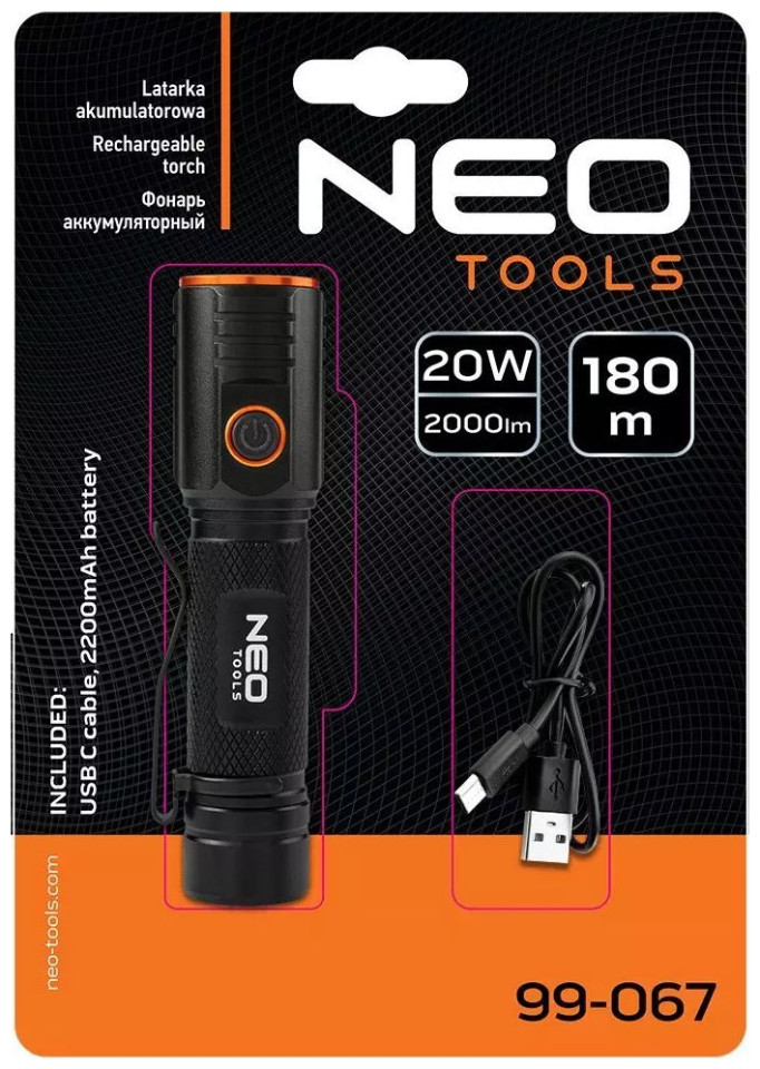 Ένας ανθεκτικός και πολλαπλών λειτουργιών επαναφορτιζόμενος φακός της μάρκας NEO, που χαρακτηρίζεται από ισχύ 2000 lumens και 20 W. Εξοπλισμένος με CHN LED, έχει εμβέλεια φωτισμού έως και 180 μέτρα. Ο φακός τροφοδοτείται από τη θύρα USB C Η ενσωματωμένη μπαταρία ιόντων λιθίου 3,7 V 2200 mAh χρειάζεται 4 ώρες για να φορτιστεί πλήρως και μπορεί να λειτουργήσει για 4 ώρες. Η συσκευή διαθέτει πρακτική ένδειξη φόρτισης μπαταρίας, η οποία βοηθάει σημαντικά κατά τον προγραμματισμό ταξιδιών ή εκδρομών.