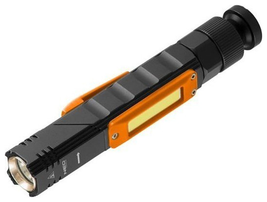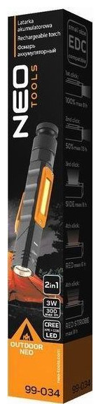 Ο επαναφορτιζόμενος φακός NEO (αρ. 99-034) είναι ένα προϊόν 2 σε 1 Είναι εξοπλισμένο με μοντέρνο CREE XPE LED και COB LED με φωτεινή ροή 300 lumens και ισχύ 3W. Η μέγιστη εμβέλεια είναι 70 m Ο φακός τροφοδοτείται από την ενσωματωμένη μπαταρία Li-Ion χωρητικότητας 2000 mAh. Ο φακός έχει 5 λειτουργίες φωτισμού: 100%, φακός 50%, πλαϊνός φωτισμός 100%, πλαϊνός κόκκινος φωτισμός και πλαϊνός κόκκινος στροβοσκοπικός φωτισμός. Η περιστρεφόμενη δομή κεφαλής 180 μοιρών και ένας μαγνήτης στη βάση αυξάνουν τη λειτουργικότητα του φακού. Το σετ περιλαμβάνει καλώδιο USB.