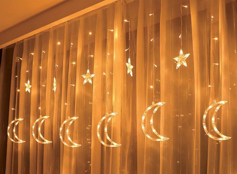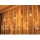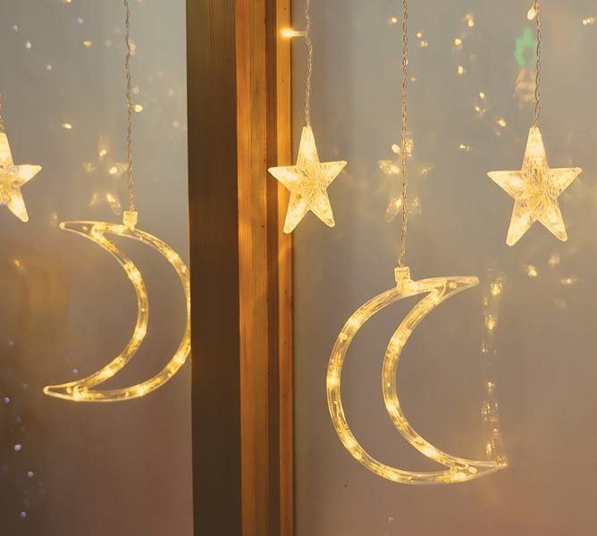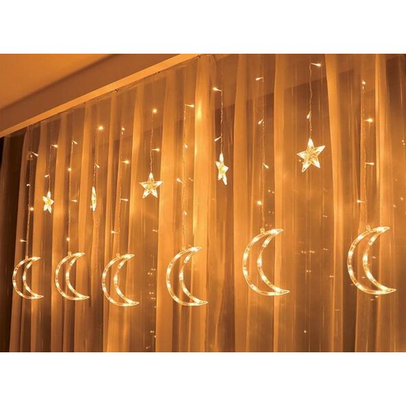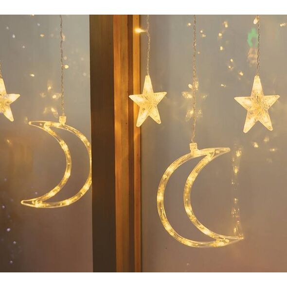 Girlanda świetlna - gwiazdy świąteczne LEDŚwiąteczna kurtyna świetlna to efektowny element dekoracyjny, który doda magii Twoim świętom. Produkt zawiera 138 równomiernie rozmieszczonych diod LED, które tworzą efektowną kurtynę świetlną. Wśród diod znajdują się 6 gwiazd oraz 6 księżycy, które dodają uroku i świątecznego klimatu. Wysokiej jakości lampki ozdobne, które świetnie sprawdzą się do zdobienia wnętrz, okien oraz dowolnej aranżacji przestrzeni.Szerokie zastosowanieDzięki 3-metrowemu kablowi od wtyczki do pierwszej diody, świecące gwiazdy Rebel możesz zawiesić na okno, klatkę schodową lub w innym dowolnym miejscu. Co więcej, produkt posiada funkcję łączenia dwóch zestawów, co zdecydowanie zwiększa możliwości wykorzystania kurtyny w Twoim domu.Zastosowane diody LED cechują się wysoką jakością i szerokim kątem świecenia. Lampki sprawdzą się idealnie jako ozdoba świąteczna oraz w pokojach dziecięcych. Dzięki zastosowaniu technologii LED lampki są energooszczędne i nie nagrzewają się.Kurtyna Świetlna - stwórz niebo we włąsnym domuLampki występują w innowacyjnej formie zwisających sopli. W porównaniu do tradycyjnych sznurów diodowych lampki składają się ze zwisających segmentów tworzących kurtynę. Każdy segment zakończony jest naprzemiennie księżycem i małą gwiazdą.Kurtyna jest wyposażona w przycisk pozwalający na zmianę trybu świecenia lampek i dostosowanie go do własnych upodobań i potrzeb.