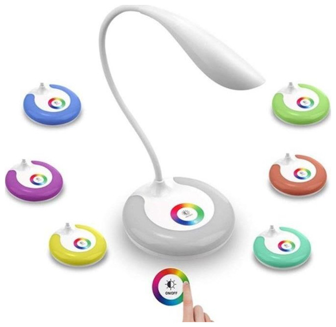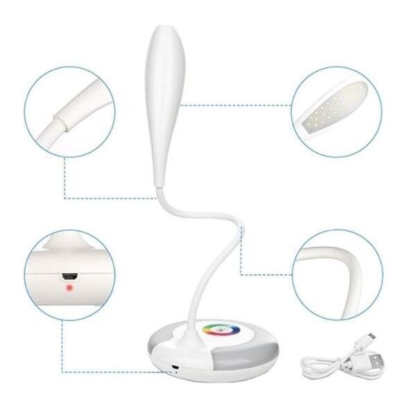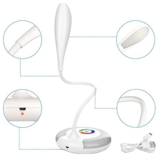 Wspaniała lampka biurkowa LED! Wyposażona w funkcję dotykowej regulacji jasności w aż 3 poziomach. Dzięki wykorzystaniu diod LED jest niezwykle energooszczędna. Posiada podstawę podświetlaną w wielu kolorach RGB. Lampka posiada dodatkowo elastyczne ramię które umożliwia regulację kąta ramienia (nachylenia). Bardzo stylowy i praktyczny dodatek do każdego biurka oraz jako dodatkowe doświetlenie innych pomieszczeń. W zestawie również zasilacz USB 5V. Cechy produktu: Produkt fabrycznie nowy, wysokiej jakości. Stylowa i energooszczędna. Wyposażona w aż 24 diody LED SMD2835 o naturalnej barwie światła + 7 diod SMD5050 RGB LED w podstawie lampki. Podświetlana podstawa w wielu kolorach. Reaguje na dotyk zmieniając barwę. Elastyczne, regulowane ramię, umożliwia skierowanie światła w dowolne miejsce. Wyposażona w panel dotykowy (ściemniacz), dzięki któremu wyregulujesz poziom intensywności świecenia w aż 3 poziomach. Posiada system ochrony oczu przed naświetleniem. Specyfikacja: Materiał: tworzywo sztuczne Moc: 5W Zasilanie (napięcie wejściowe): USB 5V 0,5A Czas ładowania: ok 3-4 h SMD LED: łącznie 31 diod Epistar CRI: RA>80 Barwa światła: 6000-6500K (dzienna - zimna) Żywotność diod: do 50 000 godzin Regulacja pochylenia ramienia: 120 stopni Przyciemnienie / regulacja jasności: 3 poziomy (ściemniacz dotykowy) Wymiary podstawy: 11,5 x 11,3 cm Maksymalna wysokość lampy: 50 cm (po wyprostowaniu) Waga: 340g Kolor: jak na zdjęciu W zestawie: Lampka biurkowa LED z akumulatorem Zasilacz USB 5V Zapraszamy do złożenia zamówienia!