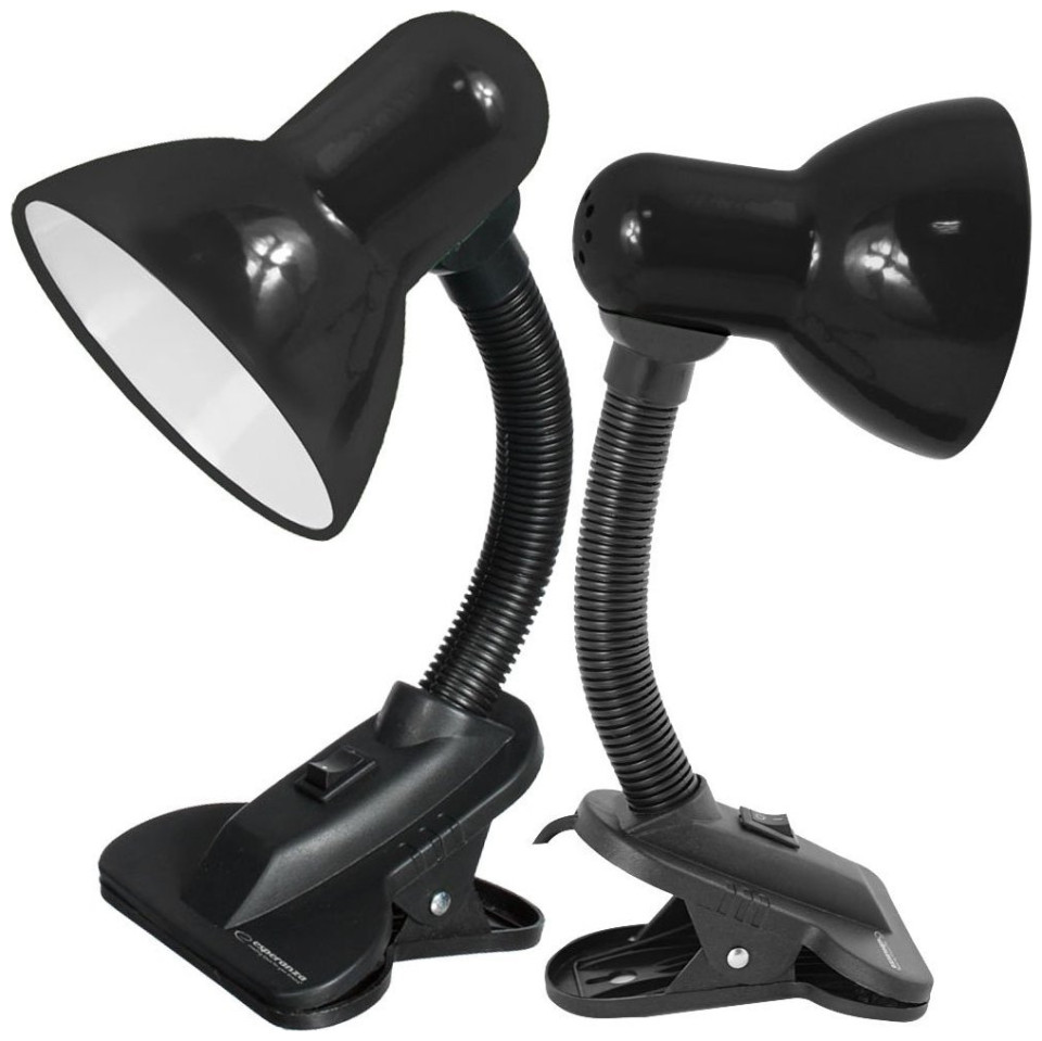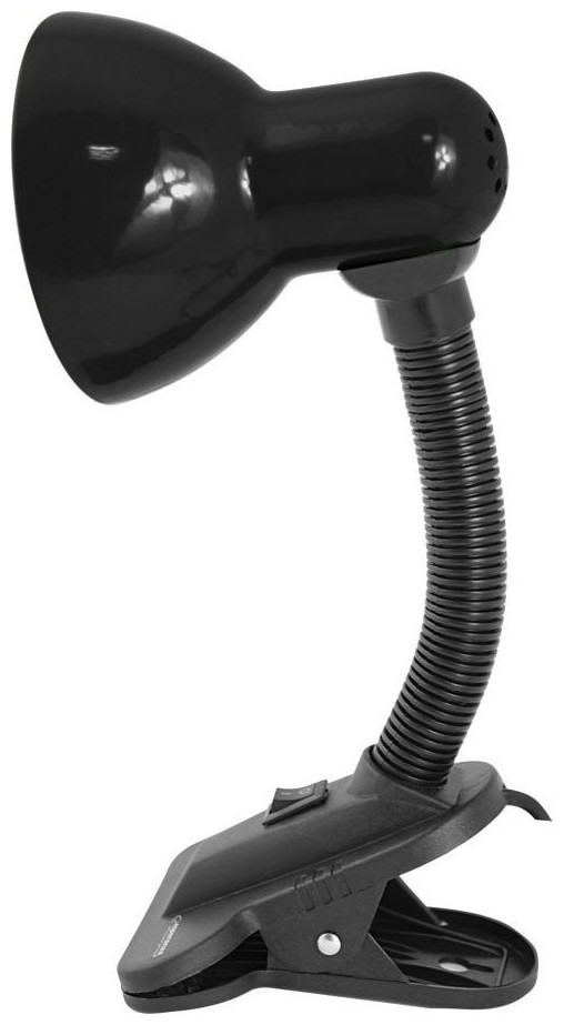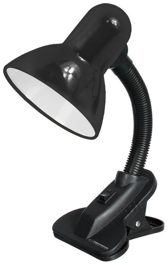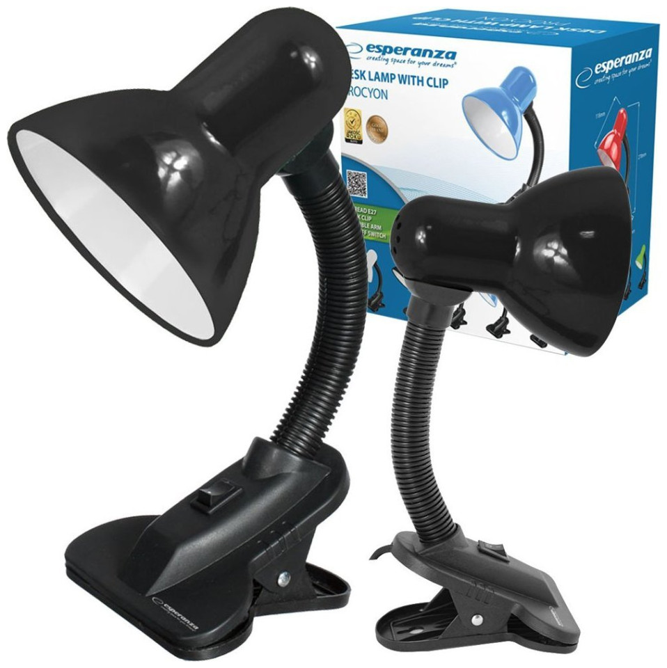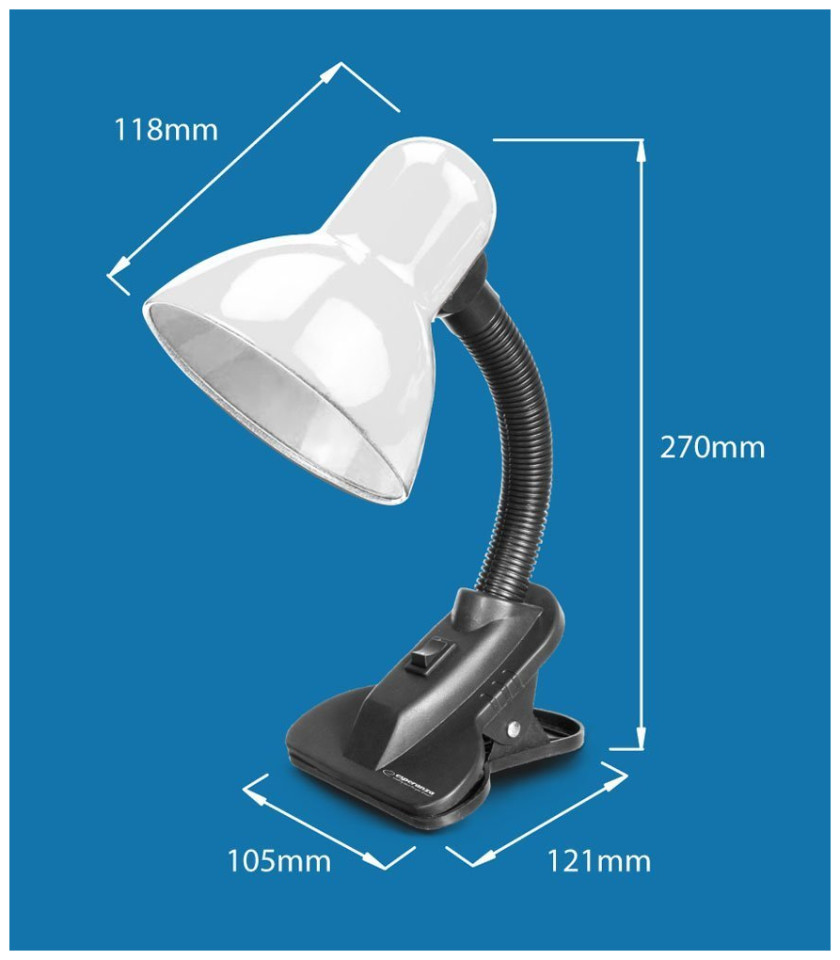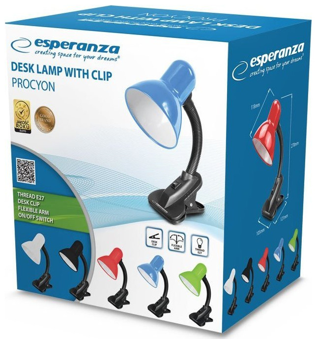 Lampka biurkowa z klipsemNiewielka, przenośna lampka biurkowa z klipsem, który umożliwia łatwy i szybki montaż lampki do biurka, półki lub innej powierzchni. Elastyczne ramię umożliwia ustawienie lampki pod dowolnym kątem, dzięki czemu możemy dowolnie regulować kierunek światła. W lampce można instalować żarówki LED z gwintem E27 i mocą do 12W.