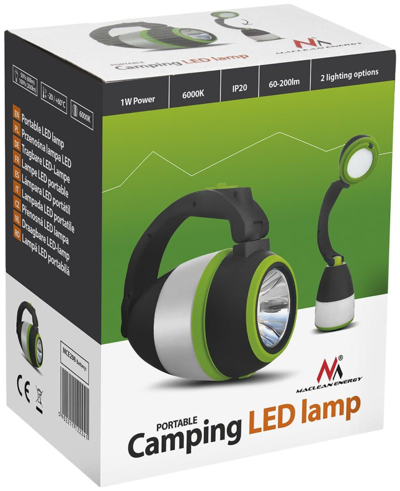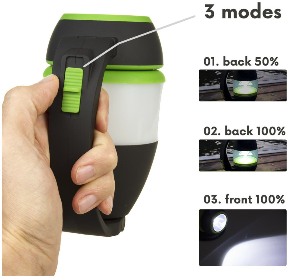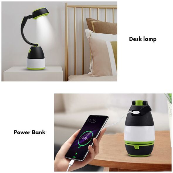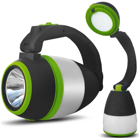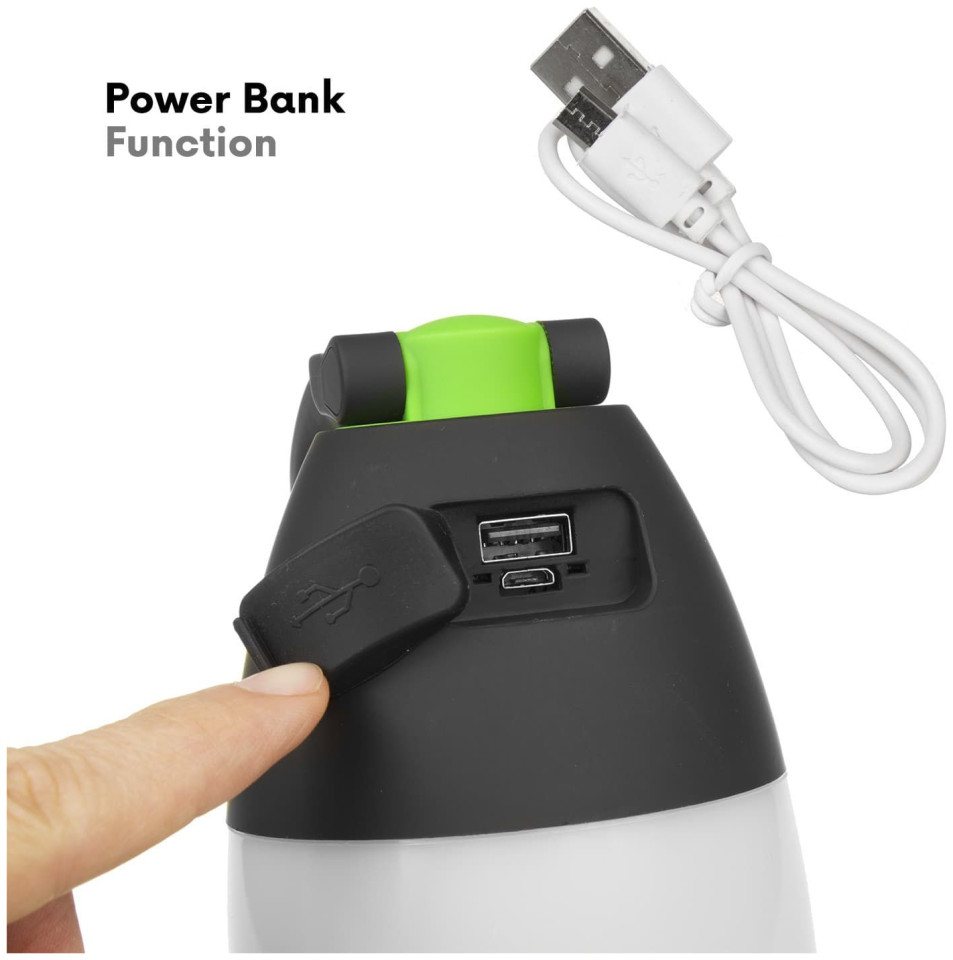 Wysokiej jakości wielofunkcyjna lampka LED. Może służyć jako latarka lub lampka kempingowa, a po rozłożeniu również jako lampa biurkowa. Idealna do zabrania na pieszą wędrówkę, biwak, wypad na ryby lub spacer po lesie. Wbudowany przełącznik pozwala na wybranie jednego z trzech trybów świecenia: 50% i 100% dla tylnego światła i 100% dla przedniego światła.Akumulator o pojemności 1500 mAh zapewnia do 6 godzin pracy. Akumulator można naładować za pomocą kabla micro USB (brak w zestawie), po podłączeniu do portu USB komputera PC, laptopa, lub ładowarki telefonu. Funkcja powerbanku umożliwia ładowanie telefonu, smartfona lub tabletu z portu USB latarki.Specyfikacja techniczna:Zasilanie: akumulator litowy 1500 mAhCzas ładowania: 8 godzinCzas pracy: 5-6 godzinStopień ochrony: IP20Moc znamionowa: 1 WStrumień świetlny: maksymalnie 200 lumenówZakres temperatury pracy: od -20°C do +60°CTemperatura barwowa: 6000K (zimna biała)