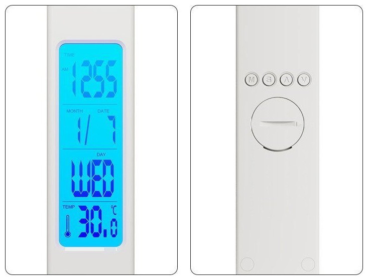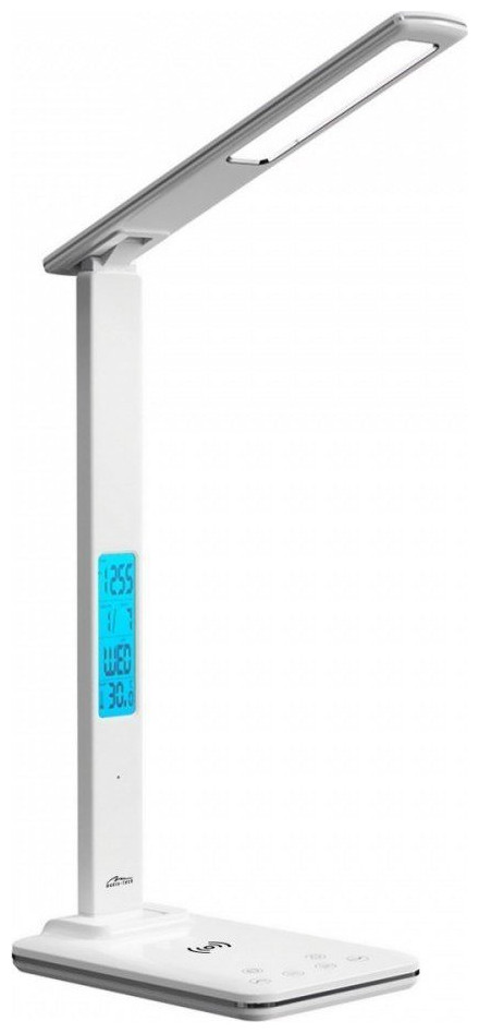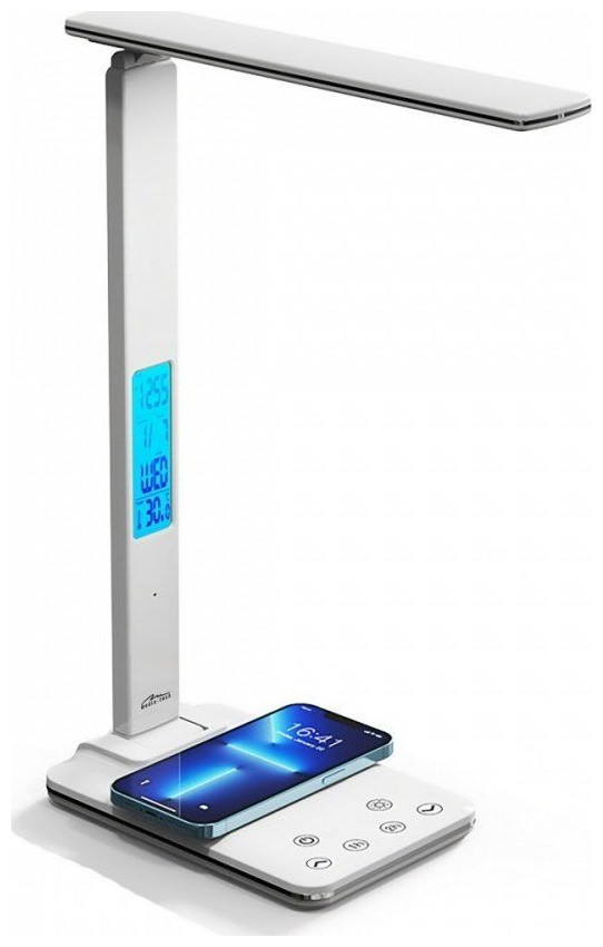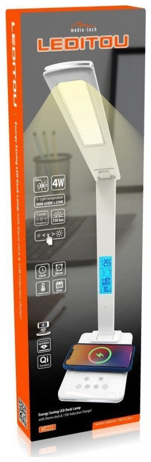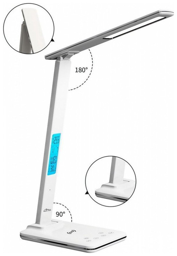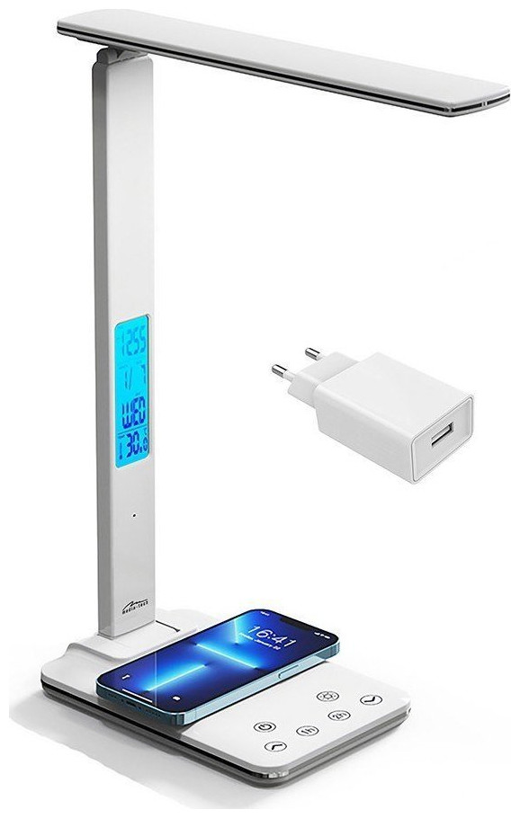 Energooszczędna lampa biurkowa LED z ładowarką indukcyjną 15W. Podświetlany zegar z budzikiem i termometrem °C/°F.