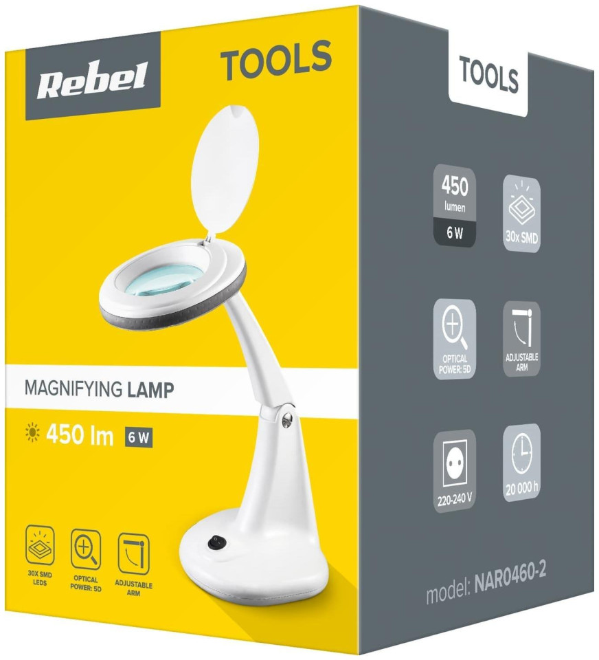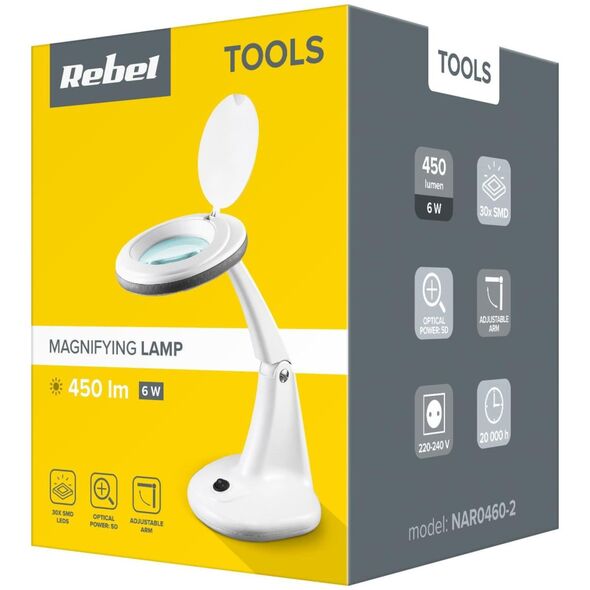 Regulowane ramię Soczewka: szklana, 4 calePowiększenie: 5DŻródło światła: Super jasne diody LED 48 SMDNiski pobór energii: 6 W Kolor: białyStrumień Świetlny: 450 lm Temperatura barwowa: 6500 KŻywotność: 20000 hNapięcie:AC 220-240 V, 50 Hz