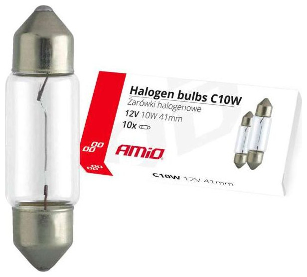 FESTOON C10W 41MM 12V 10W ZASTOSOWANIE: OŚWIETLENIE WNĘTRZA OŚWIETLENIE SCHOWKA OŚWIETLENIE TABLICY REJESTRACYJNEJ OZNACZENIE: C10W TRZONEK: SV8.5 NAPIĘCIE: 5W / 12V 1 opakowanie = 10sztuk