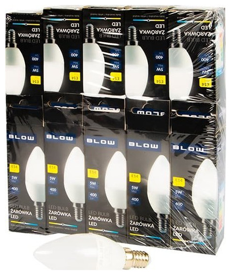 Specyfikacja:Technologia: LEDRodzaj gwintu: E14Kształt: świeczkaMoc: 5WJasność: 400lmBarwa światła: biały neutralnyTemperatura barwowa: 4000KNapięcie zasilania: 220-240V AC, 50/60HzKlasa energetyczna: A+Ilość sztuk: 10Zestaw 10 żarówek marki BLOW wykonanych przy użyciu nowoczesnych rozwiązań wykorzystujących innowacyjną technologię diod LED, które charakteryzują się wysoką wydajnością parametrów świetlnych, wiernym odwzorowaniem kolorów oświetlanych przedmiotów oraz wyjątkowo długą trwałością.