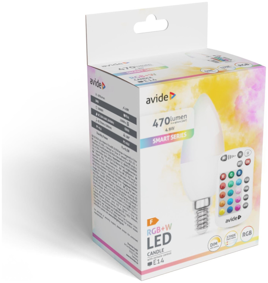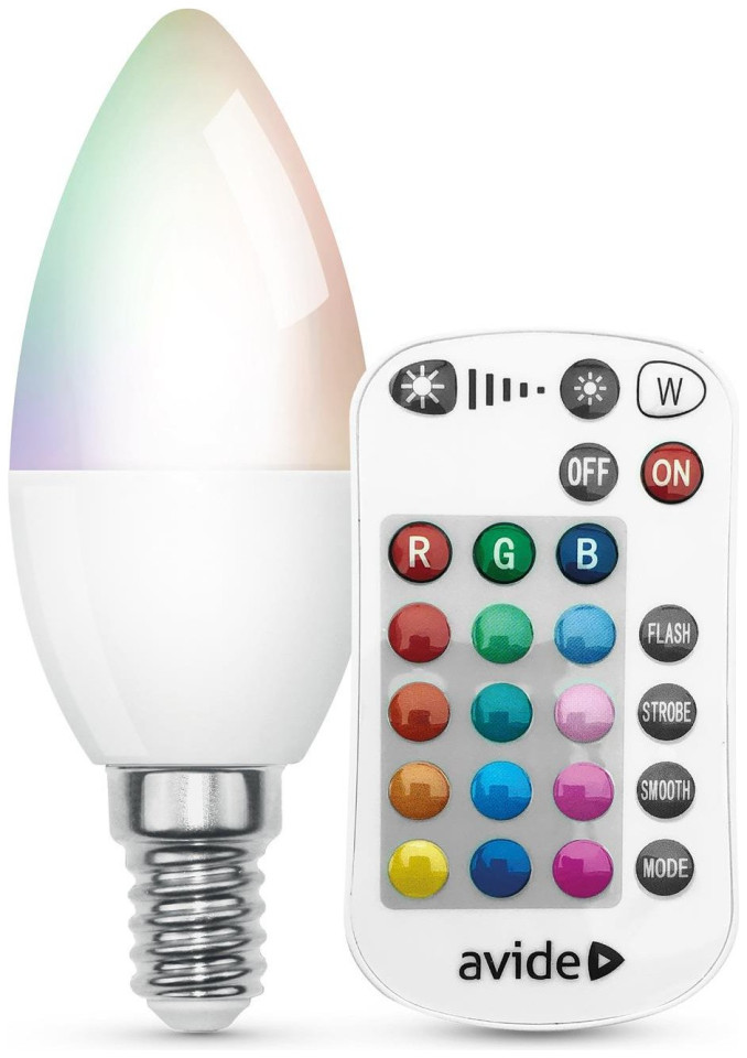 Λάμπα LED AVIDE, E14, 4.9W (=40W), RGB, 2700K, 470 lm, ρυθμιζόμενη, 360 μοίρες, με τηλεχειριστήριο