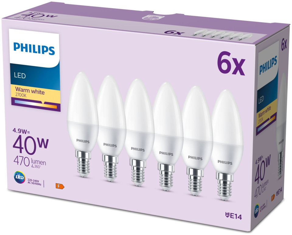 Philips LED κλασική λάμπα 40W E14 κερί ζεστό 470lm ματ 6 τεμ