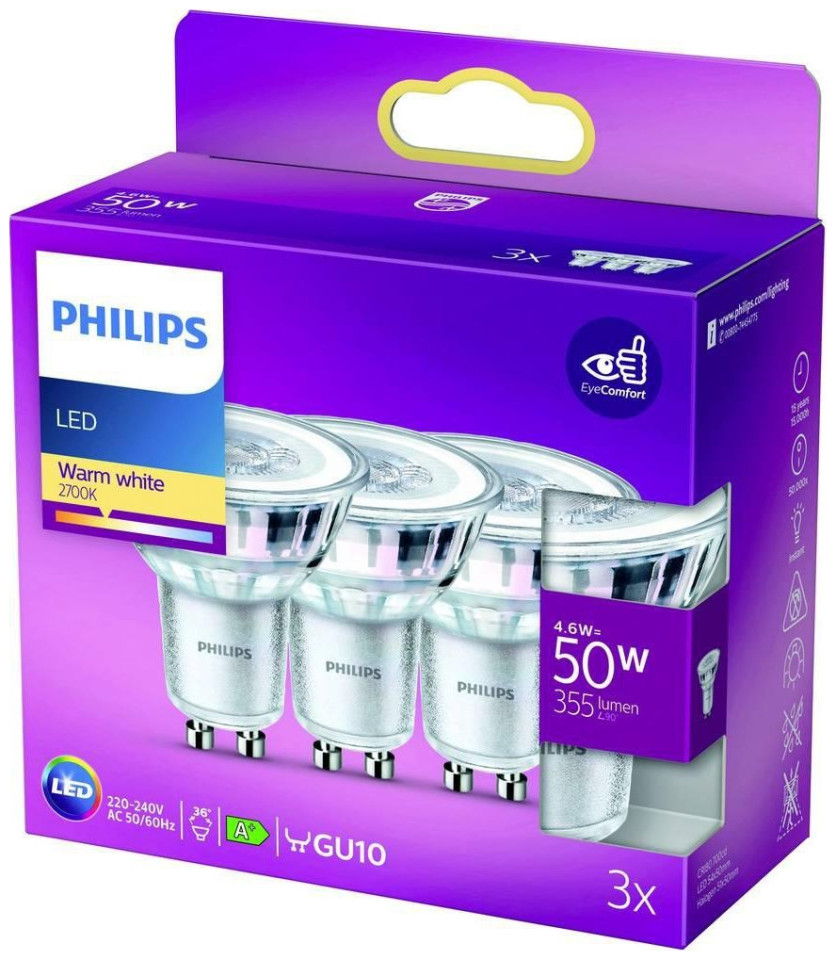 Ciepły odcień białego światła LED Tworzenie ciepłego i miłego nastroju Żarówka Philips LED zapewnia bardzo ciepłe światło, wyjątkową trwałość i natychmiastowe znaczne zmniejszenie zużycia energii. Dzięki temperaturze barwowej przypominającej kolor płomieni jest to doskonały wybór do stworzenia przytulnej atmosfery.•Idealny wybór do oświetlenia punktowego•Ciepłe, białe światło przypominające światło żarowe•Zastępuje punktowy reflektor halogenowy