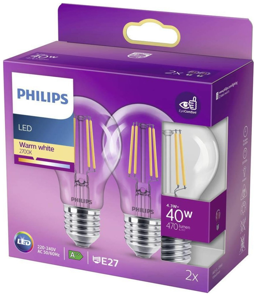 Λάμπα LED Philips E27, 4.3W, 470lm, 2700K 2 τεμ.