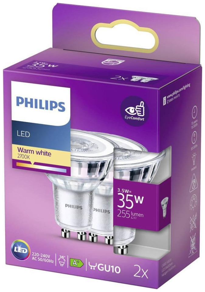 Λάμπα LED Philips GU10 3.5W, 255lm, 2700K 2 τεμ.