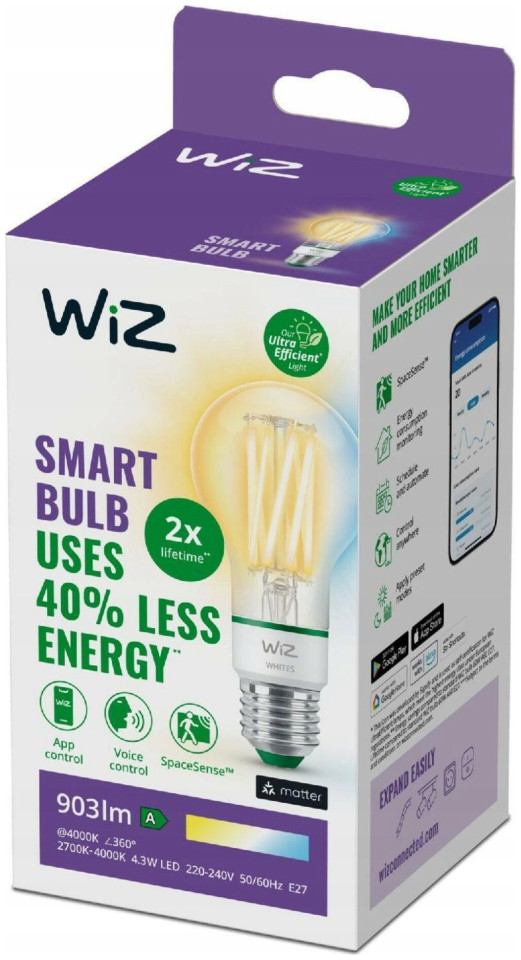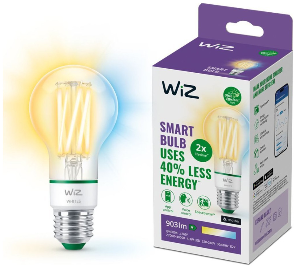 Λάμπα Signify WiZ White 60W E27 A60 Standard Filament διαφανής ρυθμιζόμενη