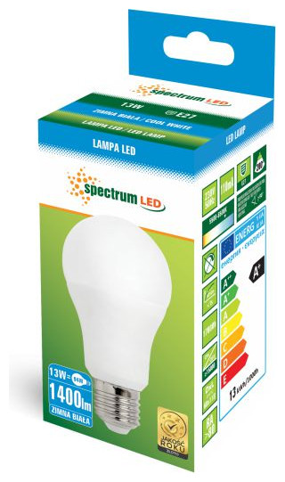 Seria Spectrum LEDNapięcie (V) 230Moc (W) 13Trzonek E-27Kąt rozsyłu światła (st) 200Temperatura barwowa Barwa zimnaWskaźnik oddawania barw (CRI) 80-89Średnia trwałość (h) 17000Prąd nominalny (mA) 110Średnia ilość włączeń 15000Możliwość ściemniania NieTyp diody SMD 2835Wymiary (mm) 68x127Stopień ochrony IP 20Zużycie energii (kWh/1000h) 13 kWh/1000hKlasa energetyczna A+