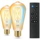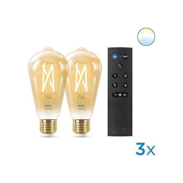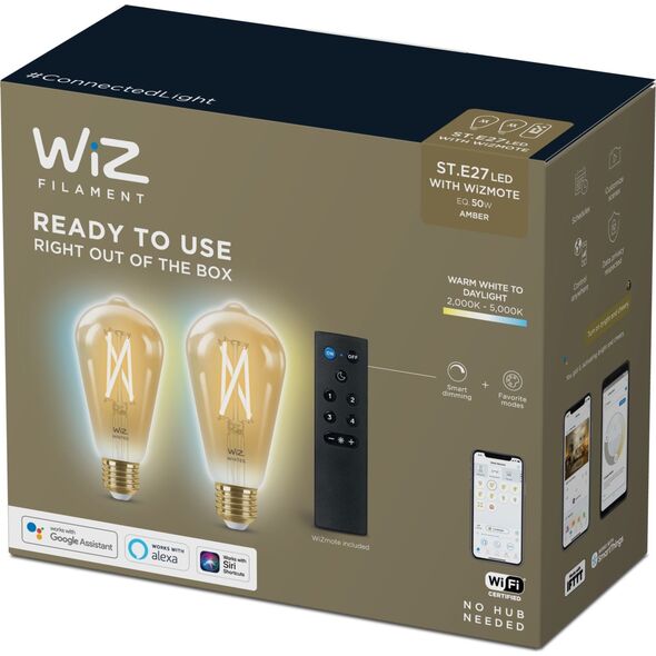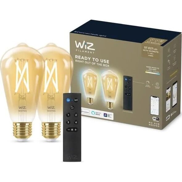 Poznaj WiZ Nasze dynamiczne tryby oświetlenia, opracowane w Paryżu przez ekspertów oświetleniowych, pozwalają stworzyć niezwykłe wrażenia unikalne dla WiZ.Zestaw: WiZ Bursztynowa żarówka E27 7W (2szt.) + pilot do sterowania Łatwa w obsłudze żarówka w stylu retro z regulacją barwy światła białego Wybierz dowolny odcień ciepłej lub chłodnej bieli. Za pomocą aplikacji WiZ lub przy użyciu poleceń głosowych możesz przyciemniać i rozjaśniać światło lub korzystać z zaprogramowanych trybów oświetlenia w konfiguracjach Wi-Fi. Uruchomienie i funkcjonalność: Błyskawiczna konfiguracja Dostosowanie aranżacji Białe światło w temperaturze od ciepłej do chłodnej oraz tryby zaprogramowane Wiele opcji sterowania oświetleniem Kontrola z dowolnego miejsca Styl klasyczny dzięki żarówce żarnikowej LED Możesz łatwo sterować światłem kiedy jesteś poza domem przez zaplanowanie automatycznego włączania i wyłączania światła. Nie ma potrzeby instalowania dodatkowego sprzętu, takiego jak koncentrator czy brama dostępu do sieci!Monitoruj zużycie energii W aplikacji WiZ możesz zobaczyć, ile energii zużywają Twoje lampy. Za pomocą raportów dziennych i tygodniowych możesz łatwo kontrolować zużycie energii w domu.Aktywuj światła ruchem bez czujników Technologia WiZ SpaceSense pozwala zmienić punkty oświetleniowe w czujniki ruchu. Mając w pomieszczeniu co najmniej dwie lampy WiZ, możesz aktywować funkcję SpaceSense w aplikacji WiZ, dzięki czemu światła będą włączać się i wyłączać automatycznie po wykryciu ruchu.Stwórz odpowiedni nastrój za pomocą regulowanego światła białego od barwy chłodnej do ciepłej Wybieraj spośród wielu odcieni światła białego, od energetyzującego i ziemnego po ciepłe i przytulne, lub po prostu wybierz jeden z zaprogramowanych trybów, takich jak Skupienie czy Relaks, aby wytworzyć w pomieszczeniu pożądany nastrój.Współpracuje z Google Home, Alexą i skrótami Siri.Specyfikacja Rodzaj żarówki: LED, Gwint: E27, Kolor światła: różne odcienie białego światła Temperatura barwowa (min): 2000 K Temperatura barwowa (max): 5000 K Strumień świetlny: 640 lm Moc: 7 W Ekwiwalent tradycyjnej żarówki: 50 W Rozmiar żarówki: ST64 Współczynnik oddawania barw (CRI): 90 Standardowe rozwiązania komunikacyjne: Wi-Fi, Klasa energetyczna: F Napięcie wejściowe AC: 220-240 V, Częstotliwość wejściowa AC: 50-60 Hz,