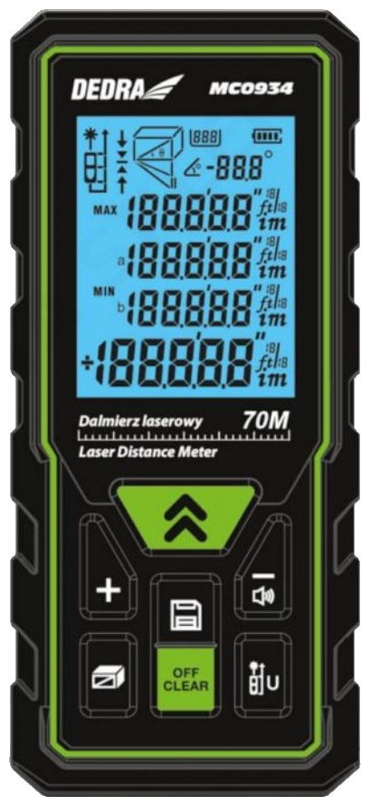 Βάρος Rangefinder: 0,1 kg {Κλάση λέιζερ} II . {Χρώμα δοκού} Κόκκινο . {Μέτρηση μήκους} Ναι. {Υπολογισμός περιοχής} Ναι. {Υπολογισμός όγκου (κύβου)} Ναι. {Μέτρηση γωνίας} Ναι. {Άθροισμα και αφαίρεση μετρήσεων} Ναι. {Συνεχής μέτρηση} Ναι. {Έμμεση μέτρηση (συνάρτηση Πυθαγόρας)} Ναι . {Ελάχιστη/μέγιστη εμφάνιση μέτρηση} Ναι. {Περιλαμβάνεται φορτιστής} Δεν περιλαμβάνεται. {Περιλαμβάνεται τρίποδο} Δεν περιλαμβάνεται. {Μπαταρίες/επαναφορτιζόμενες μπαταρίες περιλαμβάνονται} Περιλαμβάνεται . {Power} Τροφοδοτείται από μπαταρία . {Τύπος μπαταριών/επαναφορτιζόμενες μπαταρίες} 2 x AAA 1,5 V . {Protection class}IP54. {Μνήμη} 30 μετρήσεις. {Model}MC0934 . {Ακρίβεια μέτρησης} ± 2 mm. {Εύρος εργασίας} 70 m