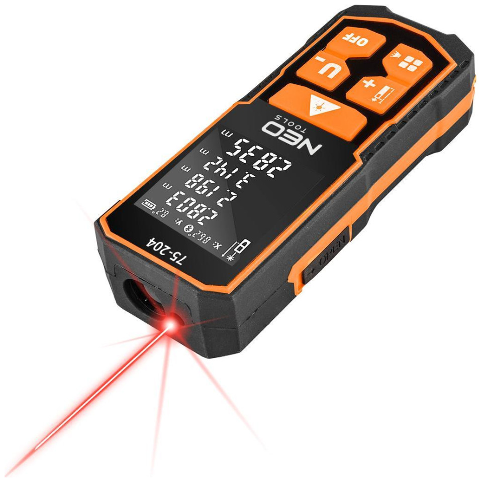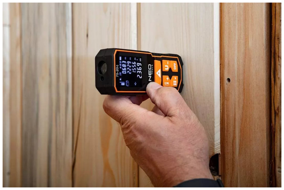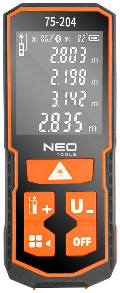Ο αποστασιόμετρο λέιζερ NEO (αρ. αναφοράς 75-204) με μέγιστη εμβέλεια 60 m είναι μια συσκευή που χρησιμοποιείται για τη μέτρηση της απόστασης, της επιφάνειας και του όγκου. Οι λειτουργίες του rangefinder επιτρέπουν επίσης έμμεσες μετρήσεις (χρησιμοποιώντας το Πυθαγόρειο θεώρημα), συνεχείς μετρήσεις, πρόσθεση και αφαίρεση, μέγιστες και ελάχιστες μετρήσεις. Οι μετρήσεις μπορούν να γίνουν από την αρχή, τη μέση και το τέλος της συσκευής και σε τρεις μονάδες μέτρησης: m/in/ft. Επιπλέον, η συσκευή είναι εξοπλισμένη με αυτόματο αλφάδι που σας επιτρέπει να διαβάζετε συνεχώς τη γωνία του αποστασιόμετρου. Διαθέτει μνήμη των τελευταίων 30 μετρήσεων. Η ακρίβεια μέτρησης είναι +/- 2 mm. Η συσκευή διαθέτει κατηγορία στεγανότητας IP54 και πιστοποιητικό CE. Το αποστασιόμετρο είναι εξοπλισμένο με ρυθμιζόμενη ένταση ήχου. Τροφοδοτείται από δύο μπαταρίες AA NI-MH ή δύο αλκαλικές μπαταρίες AA. Το σετ περιλαμβάνει καλώδιο φόρτισης USB Type-C και λουράκι καρπού.