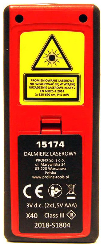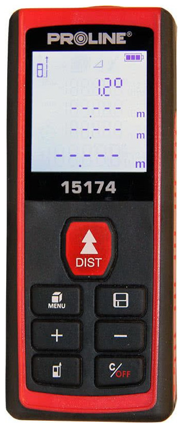 Ο αποστασιόμετρο λέιζερ Proline 15174 χρησιμοποιείται για τη μέτρηση αποστάσεων στην περιοχή από 0,05 έως 40 m. Το τέλειο εργαλείο μέτρησης που εκπληρώνει το σκοπό του οπουδήποτε δεν μπορεί να χρησιμοποιηθεί μεζούρα. Το αποστασιόμετρο έχει Πυθαγόρεια συνάρτηση (άμεση και έμμεση), συνεχή μέτρηση, υπολογισμό εμβαδού και όγκου, μνήμη για 20 αποτελέσματα, μεταβλητό σημείο έναρξης μέτρησης, αλλαγή μονάδων μέτρησης, συνεχή μέτρηση γωνίας κλίσης κατά τις μετρήσεις απόστασης, ανθεκτική οθόνη, τροφοδοσία με 2 μπαταρίες AAA, μπαταρία ένδειξης κατάστασης. Το αποστασιόμετρο 15174 διαθέτει λειτουργία οπίσθιου φωτισμού οθόνης. Η συσκευή με δέσμη μέτρησης λέιζερ έχει τάση τροφοδοσίας 3V. Η συμμόρφωση με τα ευρωπαϊκά πρότυπα διασφαλίζεται από τη δήλωση CE, ενώ η ποιότητα του προϊόντος εγγυάται 2 χρόνια εγγύηση.