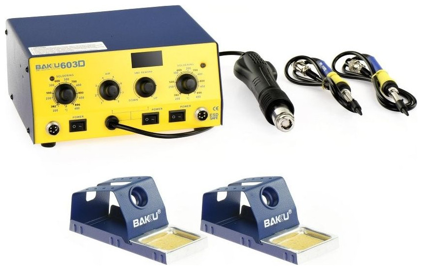 Specification: Model: 603D SMD hot air 3 in 1 LED digital display Rework Station Power: 800W Blower Fan: Brushless Fan Amount of Wind: 120L/min(MAX) Soldering Iron Temp: 200?~480? Air Temperation Range: 150?~500? Handle length: 120cm Weight: 5kg Noises: <45db Operation Instruction 1.To put the unsoldering equipment ready,and leave handle on the holder 2.To connect the power 3.To set the best nozzle(large caliber nozzle preferred) 4.To switch on the power,the screen displays"---",it represents standby mode. 5.To turn the temperature switch as to set up the require temperature.To turn the airflow switch as set up the require airflow. 6.To hold the handle,so the equipment begins to heat . To adjust the revolving switch of airflow in order to select suitable airflow in order to select suitable airflow,and begin to operate normally while the temperature is stable. 7.To put back the handle on the holder after the work,mean while the unsoldering equipment switch for heating element mode automatically. while the temperature is lower than 100°C,the screen display"---".it stands for switching for heating to standby mode,and after the temperature of Heating element is less than 70°C,the equipment is on standby. 8.To switch off the power and unplug if there is no operation for a long period of time.