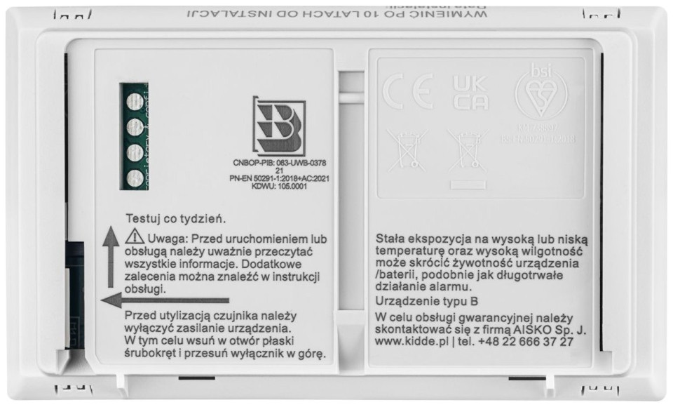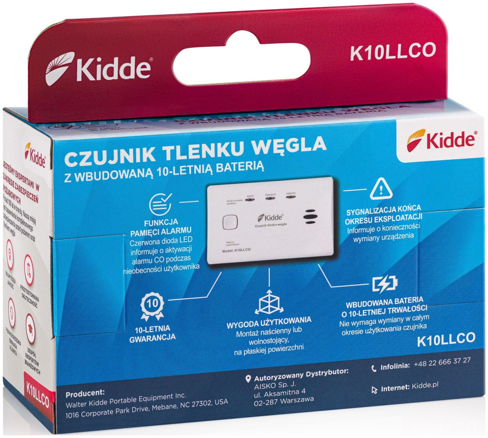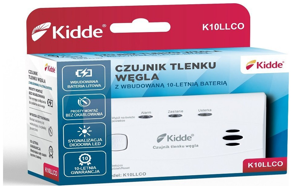 Αισθητήρας μονοξειδίου του άνθρακα K10LLCO εξοπλισμένος με ηλεκτροχημικό αισθητήρα Kidde, που εγγυάται περίοδο λειτουργίας 10 ετών. Τροφοδοτείται από ενσωματωμένη μπαταρία που δεν χρειάζεται αντικατάσταση καθ' όλη τη διάρκεια ζωής της συσκευής. Αυτή η λύση επιτρέπει στον ανιχνευτή να εγκατασταθεί σε βέλτιστη θέση στο δωμάτιο και παρέχει προστασία και σε περίπτωση διακοπής ρεύματος στο δίκτυο. Η υπέρβαση του επιτρεπόμενου επιπέδου CO σηματοδοτείται οπτικά (κόκκινο LED) και ακουστικά (δυνατός, παλλόμενος ηχητικός συναγερμός με ισχύ 85dB). Πληροφορίες σχετικά με την ανίχνευση συγκέντρωσης CO που υπερβαίνει τα 100 PPM αποθηκεύονται στη μνήμη της συσκευής. Χάρη σε αυτό, ο χρήστης μπορεί να βεβαιωθεί ότι δεν σημειώθηκαν εκπομπές μονοξειδίου του άνθρακα στο δωμάτιο κατά τη διάρκεια της απουσίας του. Ο αισθητήρας διαθέτει κουμπί δοκιμής/επαναφοράς που σας επιτρέπει να ελέγχετε τη λειτουργία της συσκευής και να επαναφέρετε το σήμα συναγερμού Το σύστημα ελέγχου απόδοσης παρακολουθεί συνεχώς, μεταξύ άλλων: τον αισθητήρα, τα εσωτερικά κυκλώματα και την κατάσταση της μπαταρίας. Σε περίπτωση μη φυσιολογικής λειτουργίας ή χαμηλής στάθμης μπαταρίας, το κίτρινο LED αναβοσβήνει και ακούγεται ένας προειδοποιητικός ήχος. Επιπλέον, ο αισθητήρας είναι εξοπλισμένος με μια λειτουργία που σας επιτρέπει να ελέγχετε γρήγορα τη σωστή απόκριση του αισθητήρα στο αέριο δοκιμής CO Χάρη στο ειδικά σχεδιασμένο περίβλημα, εκτός από την τοποθέτηση στον τοίχο, ο αισθητήρας μπορεί επίσης να τοποθετηθεί σε α επίπεδη επιφάνεια, π.χ. σε κομοδίνο κοντά στο κρεβάτι. Διαθέτει κλειδαριά που εμποδίζει την αποσυναρμολόγηση της συσκευής που είναι εγκατεστημένη στον τοίχο. Μετά από 10 χρόνια μετά την ενεργοποίηση της τροφοδοσίας, ο αισθητήρας θα σας υπενθυμίσει να αντικαταστήσετε τη συσκευή K10LLCO φέρει το σήμα κατασκευής B που επιβεβαιώνει τη συμμόρφωση με το πολωνικό πρότυπο PN-EN 50291-1: 2018 + AC 2021 για οικιακούς ανιχνευτές μονοξειδίου του άνθρακα. Η έρευνα πραγματοποιήθηκε από το Επιστημονικό και Ερευνητικό Κέντρο Πυροπροστασίας Εθνικό Ινστιτούτο Ερευνών. Józef Tuliszkowski (CNBOP-PIB). Επιπλέον, διαθέτει πιστοποιητικό BSI που επιβεβαιώνει τη συμμόρφωση με τις απαιτήσεις του προτύπου BS EN 50291-1:2018 που εκδόθηκε από το βρετανικό ίδρυμα προτύπων