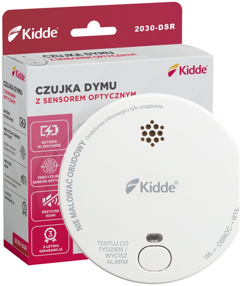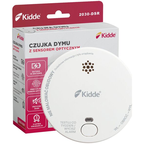 Ο οπτικός ανιχνευτής καπνού 2030-DSR τροφοδοτείται από μια αντικαταστάσιμη μπαταρία 9V και έχει σχεδιαστεί σε μινιμαλιστικό στυλ. Χαρακτηρίζεται από μικρές διαστάσεις και αισθητικό σχεδιασμό Διαθέτει κουμπί TEST & HUSH που χρησιμοποιείται για τον έλεγχο της σωστής λειτουργίας των εσωτερικών κυκλωμάτων του ανιχνευτή, καθώς και για την απενεργοποίηση συναγερμού που έχει ενεργοποιηθεί κατά λάθος (π.χ. και τα λοιπά.). Χάρη στη λειτουργία σίγασης, συνιστάται για εγκατάσταση κοντά στην κουζίνα ή στο μπάνιο Η τροφοδοσία της μπαταρίας επιτρέπει τη γρήγορη και εύκολη εγκατάσταση του ανιχνευτή σε βέλτιστη θέση στο δωμάτιο και εξασφαλίζει συνεχή προστασία ακόμη και σε περίπτωση διακοπής ρεύματος. το δίκτυο. Ο ανιχνευτής είναι εξοπλισμένος με κλειδαριά που εμποδίζει την αποσυναρμολόγηση της συσκευής από παιδιά ή μη εξουσιοδοτημένα άτομα. Συμμόρφωση με τα προαναφερθέντα το πρότυπο έχει επιβεβαιωθεί από μια ανεξάρτητη ερευνητική μονάδα TÜV Rheinland Συνιστώμενες θέσεις εγκατάστασης: σαλόνι, σαλόνι, τραπεζαρία, υπνοδωμάτιο, διάδρομος, λεβητοστάσιο, υπόγειο, κοντά σε κουζίνες, μπάνια και σε ψηλούς χώρους όπου μπορεί να υπάρχει πρόσβαση στον ανιχνευτή. Δύσκολα πλεονεκτήματα: Οπτικός αισθητήρας Kidde υψηλής ποιότητας που εξασφαλίζει μακροχρόνια και απρόσκοπτη λειτουργία του ανιχνευτή.