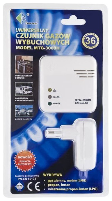 Ο αισθητήρας MTG-3000H έχει σχεδιαστεί για να παρακολουθεί τα δωμάτια για την παρουσία φυσικού αερίου (LNG, μεθάνιο), προπανίου, βουτανίου (ή του μείγματος τους). Ως ένα από τα λίγα, διαθέτει πιστοποιητικό που επιβεβαιώνει τη συμμόρφωση με τις απαιτήσεις του πολωνικού προτύπου PN-EN50194-1:2009 και PN-EN50194-2:2006 που έχει εκδοθεί από μια ανεξάρτητη ερευνητική μονάδα TUV SUD Product Service GmbH, ώστε να μπορεί να εγκατασταθεί όχι μόνο σε οικιακά δωμάτια, αλλά και σε αυτοκίνητα και τροχόσπιτα, σε σκάφη και γιοτ. Ο αισθητήρας MTG-3000H μετρά συνεχώς τη συγκέντρωση αερίου στον περιβάλλοντα αέρα. Εάν εντοπιστεί διαρροή αερίου, ενεργοποιεί οπτικά και ακουστικά σήματα συναγερμού. Ο συναγερμός απενεργοποιείται όταν η συγκέντρωση αερίου πέσει κάτω από το όριο που ενεργοποιεί τον αισθητήρα. Η συσκευή διαθέτει σύστημα αυτόματης διάγνωσης που παρακολουθεί τον αισθητήρα και τα εσωτερικά κυκλώματα. Σε περίπτωση λανθασμένης λειτουργίας, ανάβει ένα κίτρινο LED για να υποδείξει ότι εντοπίστηκε σφάλμα. Ο αισθητήρας τροφοδοτείται από ασφαλή τάση 12V DC μέσω του τροφοδοτικού 230V/50Hz που περιλαμβάνεται στο σετ. Μπορεί να τοποθετηθεί σε χώρους όπου η θερμοκρασία δεν πέφτει κάτω από -10°C και δεν ανεβαίνει πάνω από +40°C (περιοδικά -20°C από +50°C) και η σχετική υγρασία δεν ξεπερνά το 95%. Επιπλέον, μπορείτε να αγοράσετε ένα βύσμα αναπτήρα αυτοκινήτου, χρήσιμο σε τροχόσπιτα, τροχόσπιτα, σκάφη κ.λπ. Προτεινόμενες θέσεις εγκατάστασης: κουζίνες εξοπλισμένες με ηλεκτρική κουζίνα, λεβητοστάσια με σόμπες φυσικού αερίου ή προπανίου, δωμάτια με συσκευές αερίου όπως π.χ. όπως: φιάλες, μετρητές, σωλήνες αερίου, σχολικά εργαστήρια χημικών και φυσικής Ο αισθητήρας MTG-3000H μπορεί να εγκατασταθεί και σε τροχόσπιτα, σε τροχόσπιτα και σε βάρκες και γιοτ.{Τύπος} Αέριο . {Τύπος} Αέριο . {Τύπος}Αέριο
