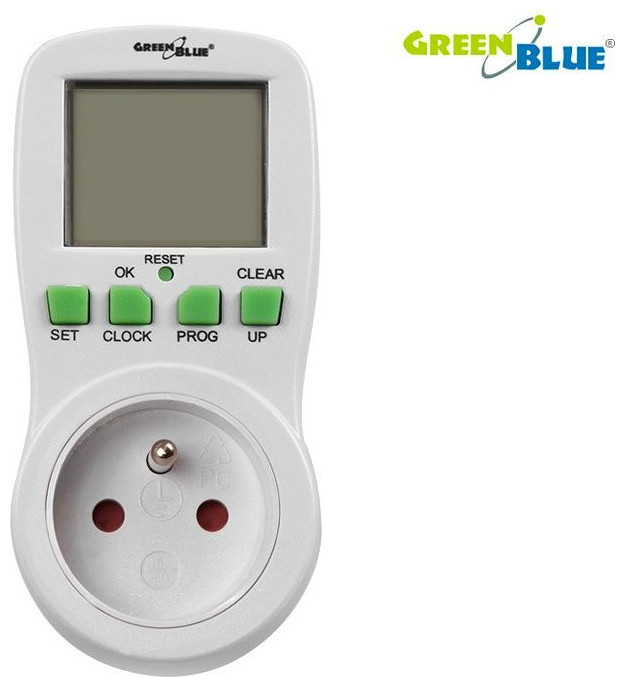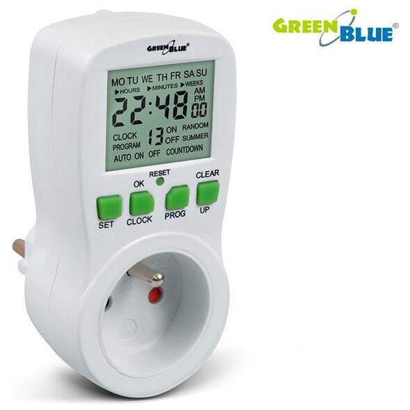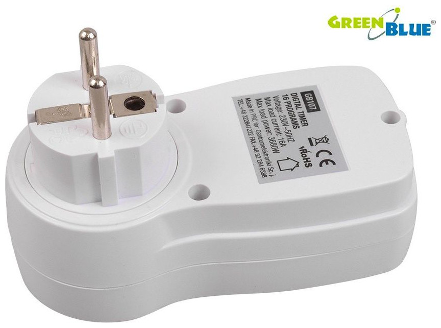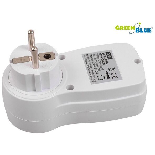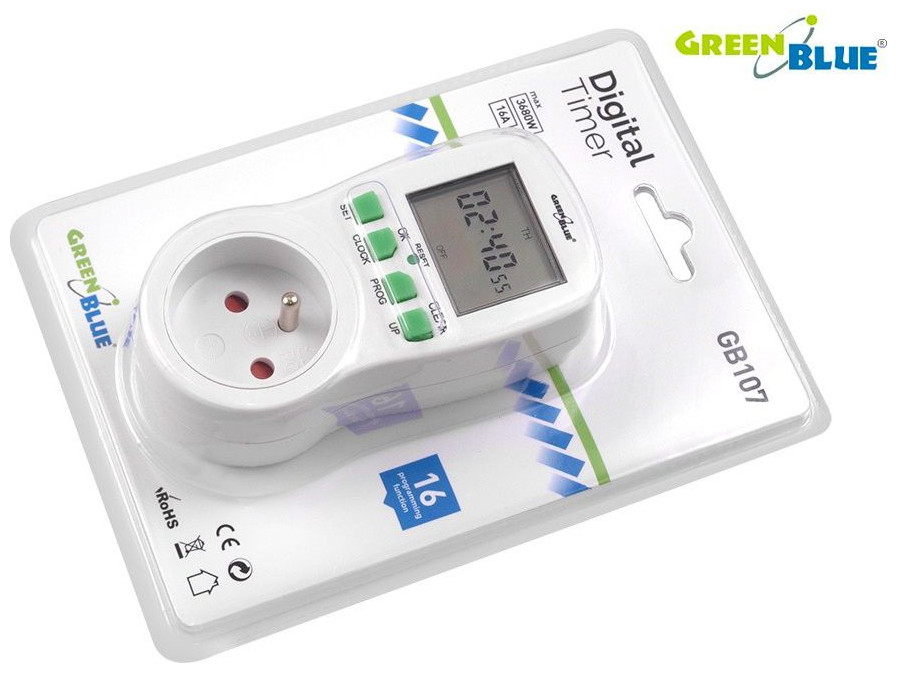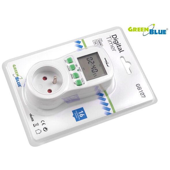 Switch timer - GreenBlue GB107 Digital timer 16 προγράμματα max 240 programs Timer GB107 Programmer 3860 Watt Διακόπτης με αντίστροφη μέτρηση (CD) Τα πιο σημαντικά πλεονεκτήματα: - Ενδιαφέρουσα εμφάνιση, τεράστια, ευανάγνωστη οθόνη - Ανθεκτικό σε χαμηλές και υψηλές θερμοκρασίες - ΕΝΣΩΜΑΤΩΜΕΝΗ μπαταρία για μνήμη backup - Εμφανίζει την τρέχουσα ΩΡΑ Κύρια χαρακτηριστικά: - 4 μεγάλα κουμπιά - για εύκολη λειτουργία - Έως 256 προγράμματα την εβδομάδα - 16 συνδυασμοί ημερών της εβδομάδας - 16 καθημερινά προγράμματα - Τυχαία λειτουργία - Λειτουργία αντίστροφης μέτρησης - Εύρος χρόνου εργασίας: 1 λεπτό έως 168 ώρες (7 ημέρες) - Μεγάλη οθόνη LCD - για καλύτερη ορατότητα - Χειροκίνητη ρύθμιση - ενεργοποίηση / αυτόματη / μη αυτόματη απενεργοποίηση - Ακρίβεια προγραμματισμού - 1 λεπτό - Λειτουργία 12/24 ωρών - Ρύθμιση θερινής/χειμερινής ώρας - Εμφάνιση σε πραγματικό χρόνο - δημιουργία αντιγράφων ασφαλείας μνήμης - χρόνος και ρυθμίσεις σε περίπτωση διακοπής ρεύματος - Επαναφορά κουμπιού- Μέγιστο φορτίο: 16A, 3860W- Τάση: 220-240VAC 50Hz- Πείρο γείωσης + προστασία παιδιών