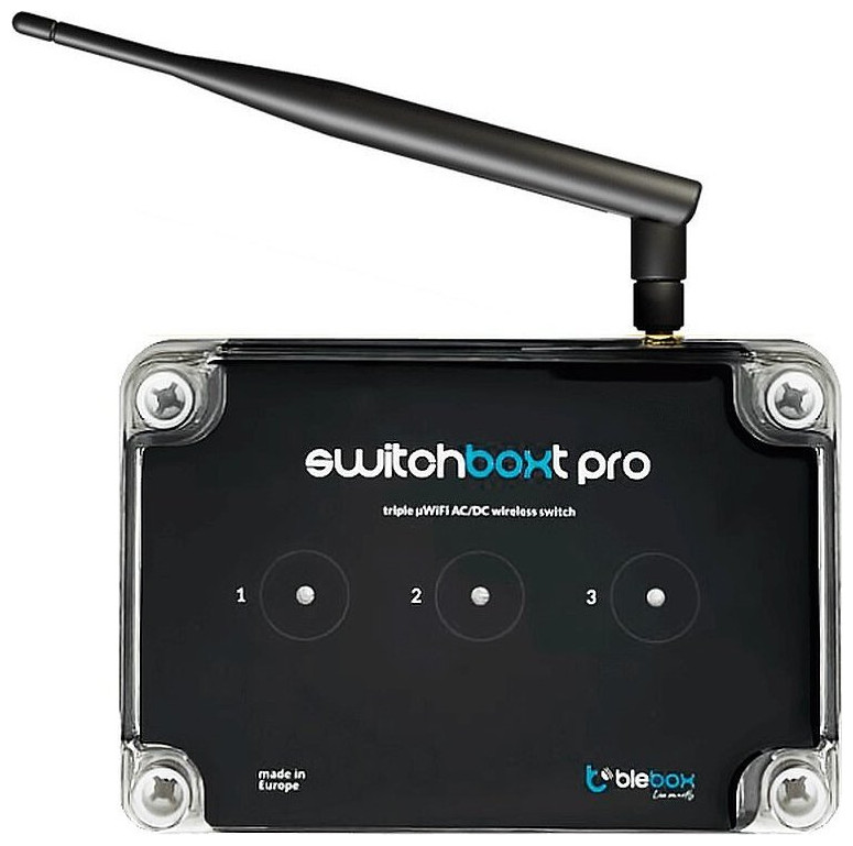 Sterownik Blebox switchBoxT PRO wyłącznik mocy Potrójny bezpotencjałowy przełącznik on/off lub ,,włącza na czas''. Harmonogramy, przycisk, akcje, powiadomienia! NAJWAŻNIEJSZE PARAMETRY Napięcie zasilania: 230V AC Zużycie energii: < 1W (standby) < 2W (praca) Ilość wyjść sterujących: 3 Typ wyjść: przekaźnikowe, NO Maksymalna moc: AC1 (rezystancyjne, power factor: 0.95): 3x (16A @ 5-230V AC) = 3x 3680W = ~11kW AC, DC1: 3x (16A @ 5-24V DC) = 3x ~380W DC, AC3 (IEC60947-4-1):, 3x ~0.5kW @ 240V AC = ~1,5kW (silnik gwiazda) Separacja galwaniczna: tak Ilość przycisków: 3 Typ przycisków: pojemnościowe (dotykowe), podświetlane, zintegrowane Ilość wejść: 3 Typ wejść: optoizolowane (separacja) Zakres napięć wejściowych: 12V .. 230V AC/DC Obsługiwane przyciski: monostabilne (dzwonkowe), bistabilne (tradycyjne, krzyżowe) - bez podświetlenia Sygnalizacja na obudowie: kolorowy, świecący panel przedni informujący o stanie pracy urządzenia Sygnalizacja sterownika: mrugająca, niebieska dioda diagnostyczna (możliwość wyłączenia w opcji sterownika) switchBoxT PRO Steruj za pomocą smartfona dowolnymi trzema urządzeniami! Harmonogram czasowy oraz zegar astronomiczny! Trzy dotykowe przyciski do sterowania z poziomu wbudowanego panelu przedniego Podłącz dowolne 3 sygnały sterujące DC/AC Bezprzewodowa automatyzacja w połączeniu z sensorami temperatury, deszczu, jakości powietrza, wiatru itd. Dodatkowo Możliwość stworzenia bezprzewodowych przycisków WiFi Możliwość sparowania ładowalnych i bateryjnych pilotów μWiFi Konfigurowalny kolor podświetlenia panelu przedniego Zewnętrzna antena zwiększająca zasięg! Steruj trzema urządzeniami! Steruj smartfonem aż trzema dowolnymi urządzeniami elektrycznymi (0-230V AC/DC – bezpotencjałowe wyjścia) Do każdego z trzech wyjść można podłączyć urządzenia o mocy aż do 3680W! Podłączysz jednocześnie urządzenia zasilane 12V DC (np. zasilacz), 24V AC (np. elektrozawór) czy 230V AC (np. lampa ogrodowa, pompa) Trzy przyciski (wejścia)! Sterownik pozwala na podłączenie do trzech przycisków (lub różnych sygnałów sterujących 12-230V AC/DC) Może być to: – Przycisk świecznikowy lub dzwonkowy – Wyjście (sygnał) z czujki ruchu, alarmu, czujnika poziomu cieczy – Sygnał z innego sterownika / systemu automatyki Akcje i sceny! switchBoxT PRO tak jak sensory i inne sterowniki z rodziny switchBox, actionBox, posiadają akcje, które pozwalają sterować innymi sterownikami (wyzwalcze scen). Przykładowo: switchBoxT PRO odczyta stan z centrali alarmowej o uzbrojeniu alarmu (wyjście z domu), a następnie bezprzewodowo wyśle rozkaz do zaworu wody „zamknij”, do każdego światła „wyłącz”, do każdej rolety „zamknij”. Harmonogram, zegar astronomiczny Harmonogram z funkcją zegara astronomicznego umożliwia sterowanie o danej godzinie oraz o wschodzie i zachodzie słońca na podstawie lokalizacji geograficznej. Przykładowo: ustaw automatyczne włączenie świateł w ogrodzie po zachodzie słońca oraz wyłączenie o 23:59 w celu oszczędności energii elektrycznej. Dzięki trzem wyjściom, możesz podzielić oświetlenie na 3 strefy włączające się o innej porze! Piloty, przyciski bezprzewodowe Z pomocą zasilanych modułów z rodziny actionBox, stworzysz przyciski do kontrolowania switchBoxT PRO, bez prowadzenia przewodów! Możesz również sparować ładowalny pilot „uRemote”, bateryjny „sRemote” oraz bateryjny moduł do przycisków (lub przycisków ściennych) „inBox”, który umieścisz gdzie chcesz! Automatyka! - akcje WiFi – W połączeniu z rainSensor (czujnik deszczu) automatycznie wyłączaj podlewanie kiedy pada. – Zastosuj wiele rozproszonych actionBoxS + czujników ruchu, które bezprzewodowo wyślą rozkaz do switchBoxT PRO aby włączył odpowiedni obwód oświetleniowy ogrodu. Koniec z „kilometrowym prowadzeniem przewodów” Dotykowy, podświetlany panel!* Na przednim panelu sterownika znajdziemy 3 dotykowe przyciski (1-3), którymi możemy włączać / wyłączać urządzenia (obwody) podłączone do sterownika. Dodatkowo przedni panel posiada funkcję podświetlenia. W aplikacji wBox możliwa jest zmiana koloru świecenia. *Aby zablokować możliwość sterowania przyciskami dotykowymi, należy podczas montażu nie podłączać panelu przedniego. Zewnętrzna antena! switchBoxT PRO został wyposażony w zewnętrzną antenę zwiększającą zasięg WiFi. Gniazdo na antenę WiFi pozwala również na wymianę antenty na antenę kierunkową. Pozwala to na zastosowanie sterownika w odległych miejscach od routera / AP, gdzie występuje słaby lub nie wystarczający sygnał WiFi. SPECYFIKACJA TECHNICZNA Napięcie zasilania