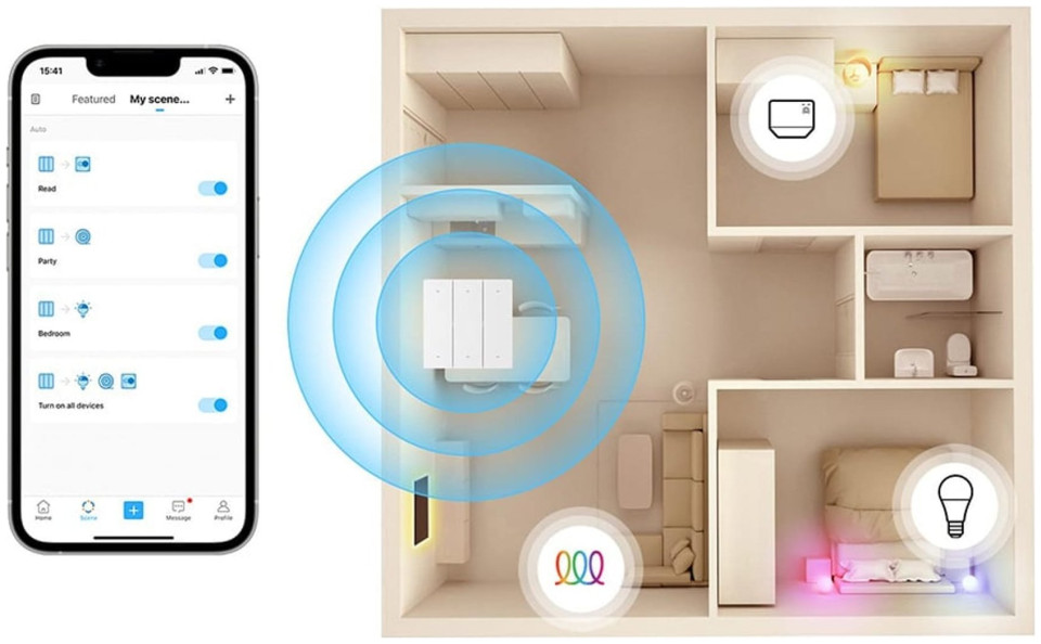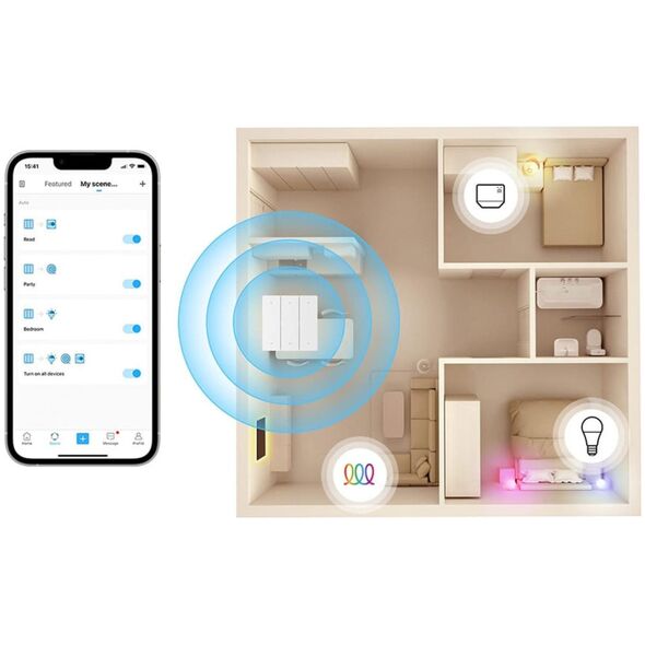 With just the press of a button, you can call up a smart scene created earlier using the app. When an Internet connection is available, you can turn on all the lights in the kitchen or turn off the bedside lamps in the bedroom with one click. In addition, one eWeLink Remote gateway device can be connected to as many as 8 R5s! This means that you can successfully use more switches to operate one lamp.