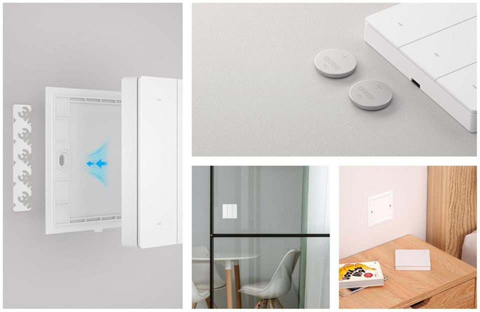 The device is extremely easy to install. Just stick it to the wall with the help of self-adhesive stickers, which you will find in the package. You don't have to worry about wiring! You can also use the switch like a regular remote control and simply put it on a table or shelf. What's more, you'll only need 2 CR2032 batteries to power the device, which will provide an operating time of up to 2 years.